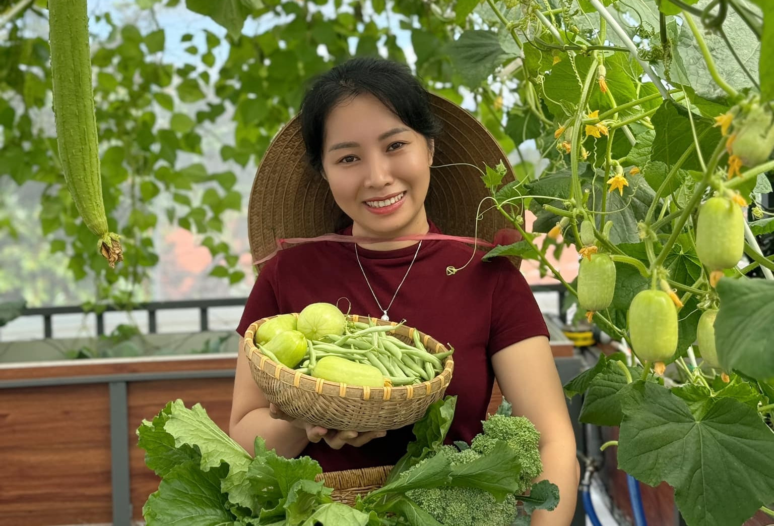 "Chậu và giàn đều do tôi thiết kế để có kích thước, vị trí đón nắng hợp lý, còn chồng tôi hỗ trợ thi công. Do đó, nhà tôi chỉ tốn tiền mua nguyên vật liệu thôi", chị Nhung cho biết.