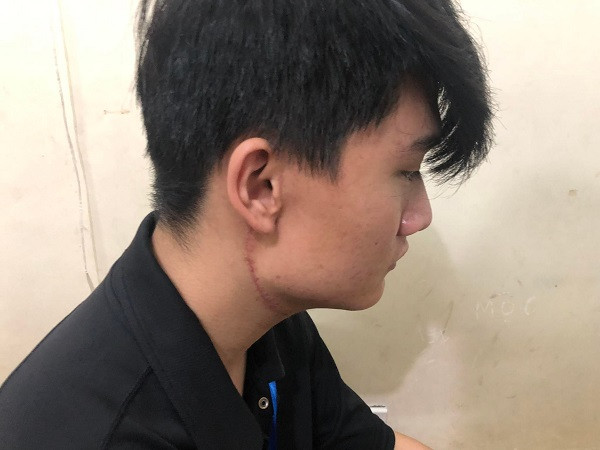 Vệt sẹo sau mổ hằn đỏ trên khuôn mặt em Thành