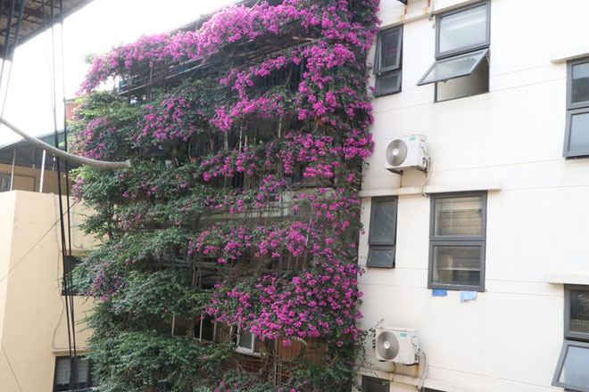 Nhìn từ bên ngoài, ngôi nhà 5 tầng nổi bật bởi nhiều lớp hoa giấy xếp chồng lên nhau, giống như một khu rừng thu nhỏ, đây cũng là thành quả 30 năm chăm sóc của ông Tầng.