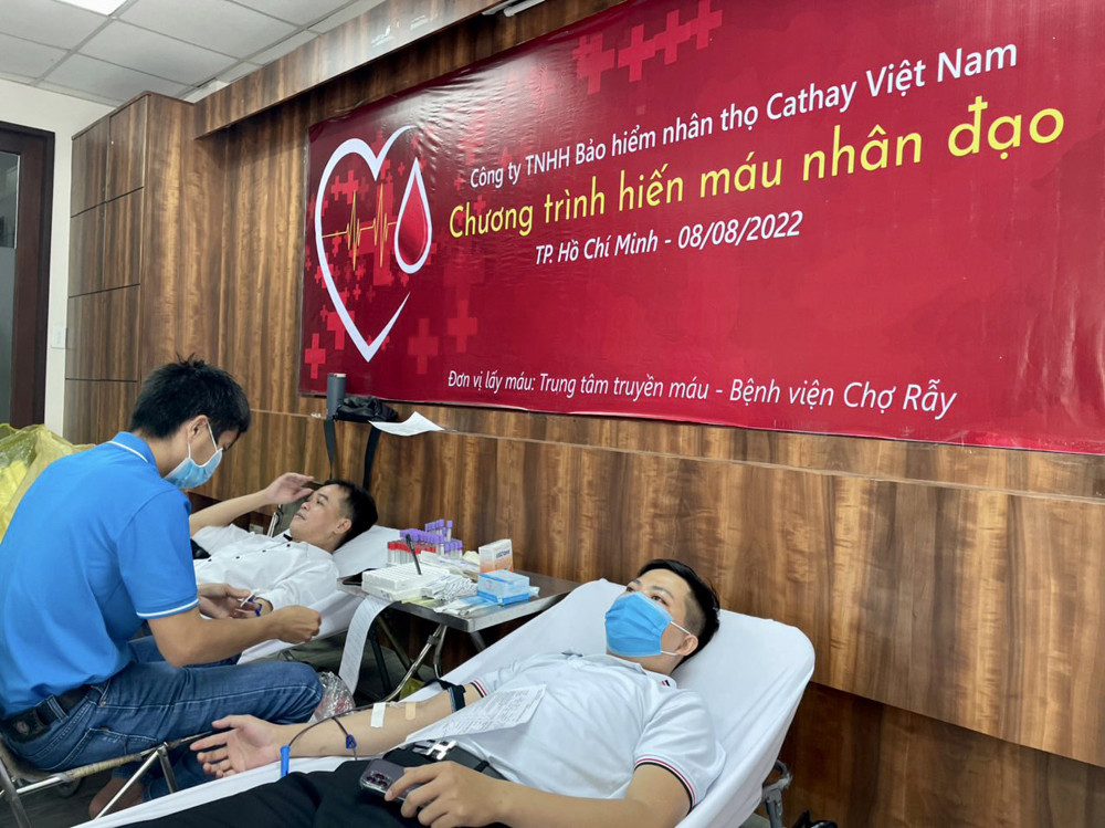 Với phương châm “Cùng gieo mầm hôm nay, cho tương lai phồn thịnh”, Cathay Life luôn tích cực tham gia các hoạt động xã hội, hoạt động thiện nguyện. Nhân dịp kỉ niệm 14 năm hoạt động tại thị trường Việt Nam, được sự hỗ trợ của Trung Tâm Truyền Máu - Bệnh Viện Trợ Rẫy, Cathay Life Việt Nam đã tổ chức chương trình hiến máu nhân đạo cho toàn thể nhân viên và khách hàng Cathay Life Việt Nam, ghi nhận hiến tượng gần 150 đơn vị máu.