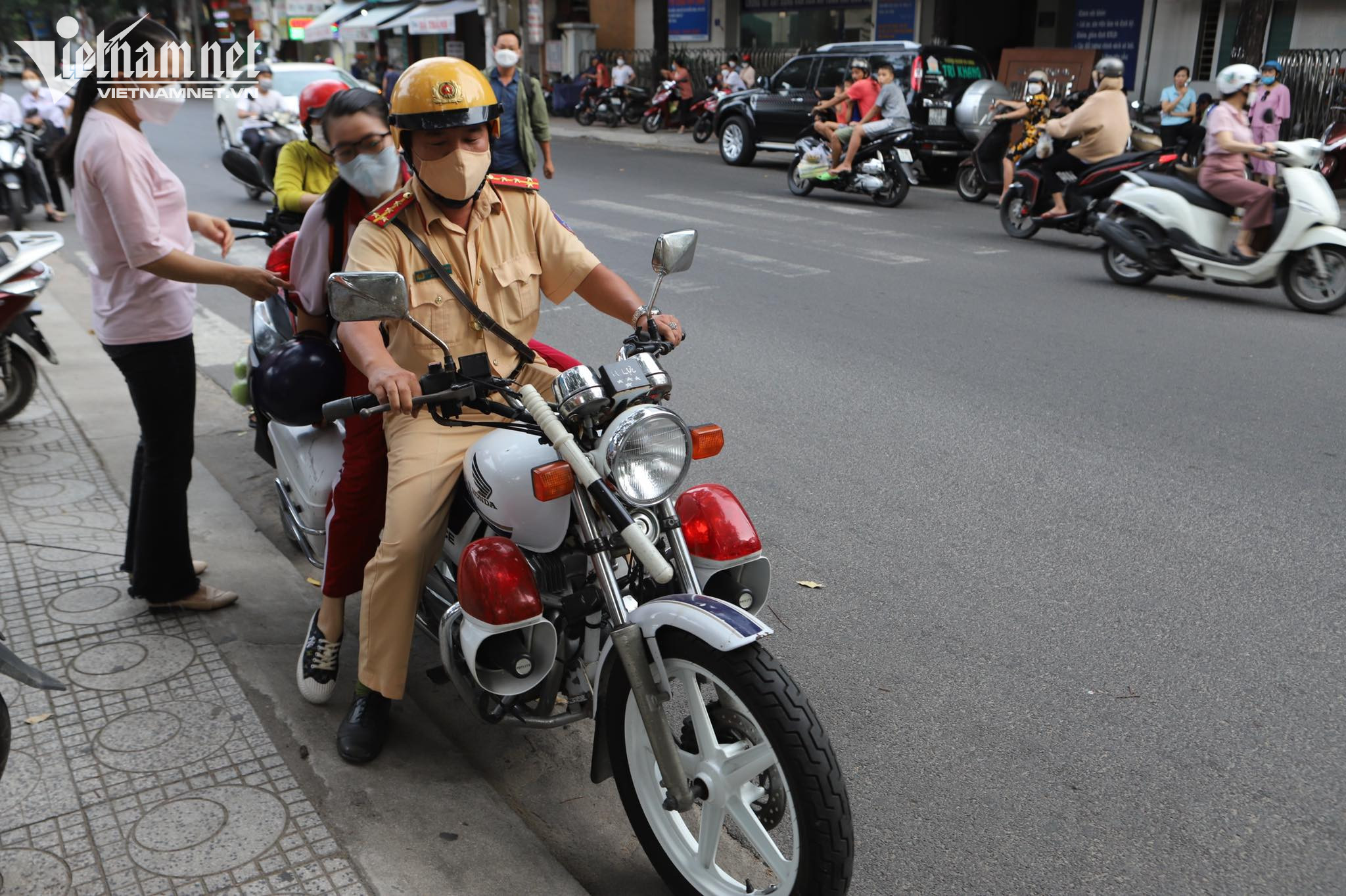 Ở điểm thi Trường THPT Lý Tự Trọng có một số thí sinh đi khá muộn, hoặc quên giấy tờ được phụ huynh mang tới. Trong đó, một chiến sĩ CSGT đội Nha Trang đã dùng xe đặc dụng chở thí sinh về nhà lấy giấy tờ. Ảnh: Xuân Ngọc