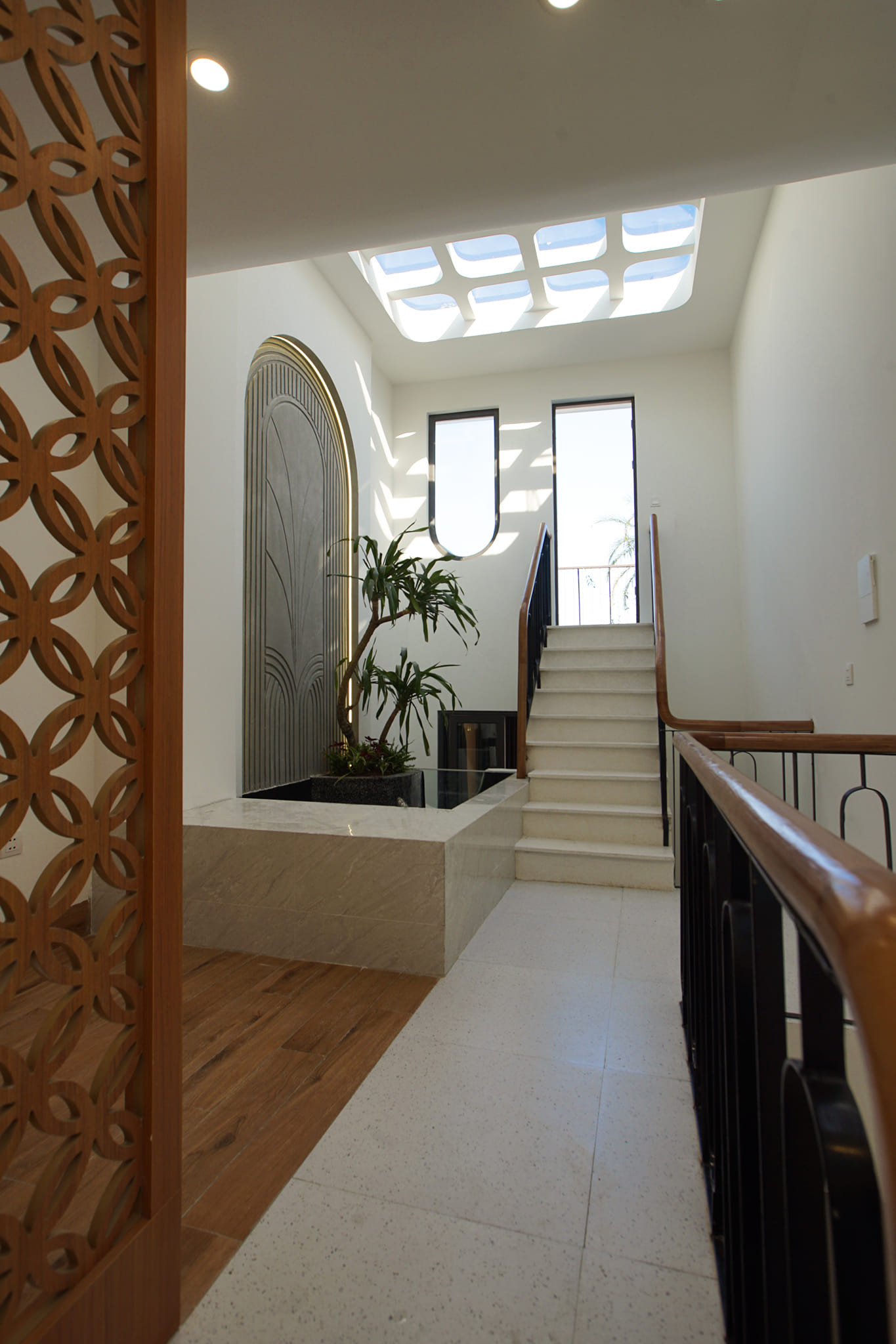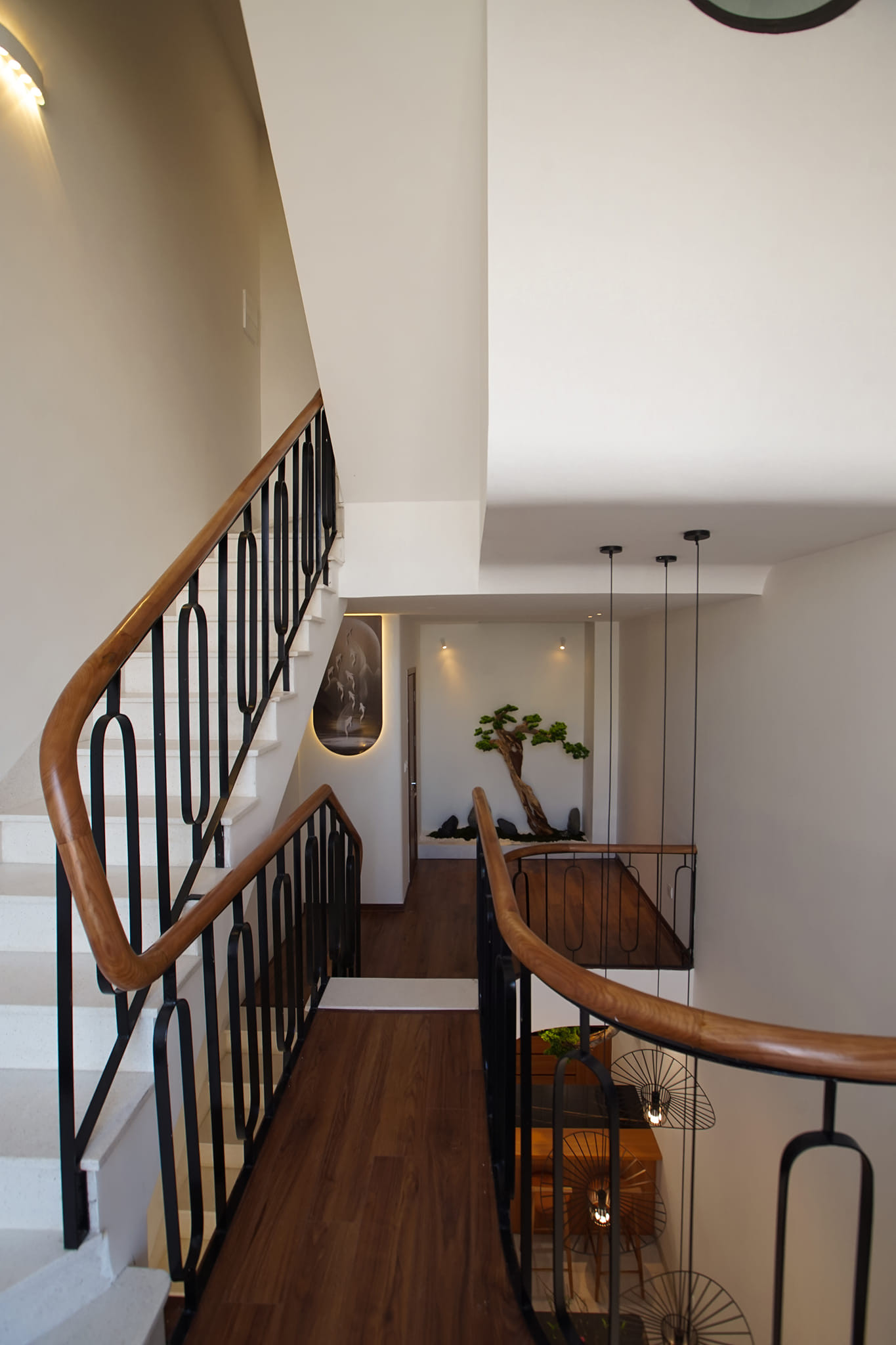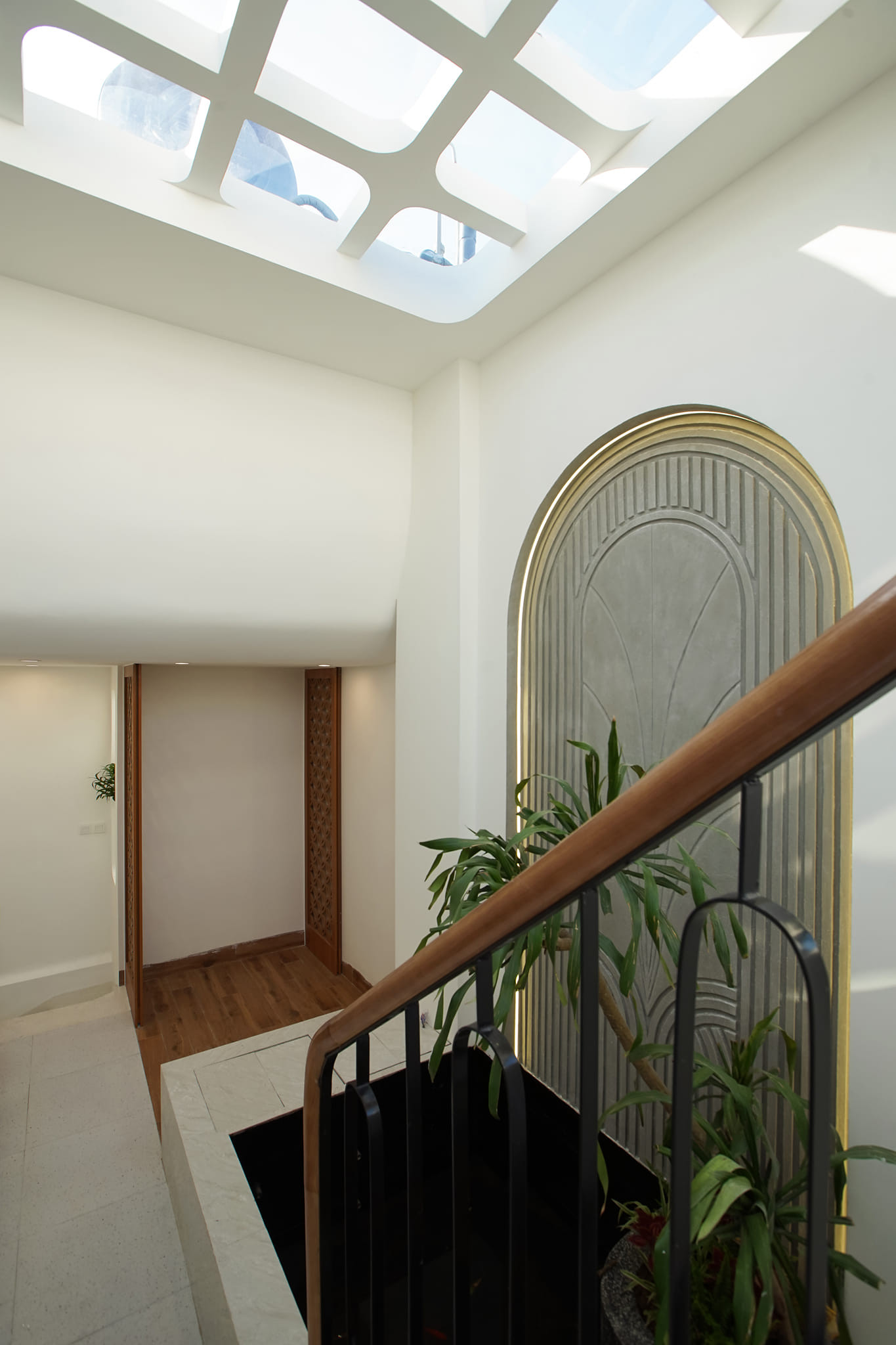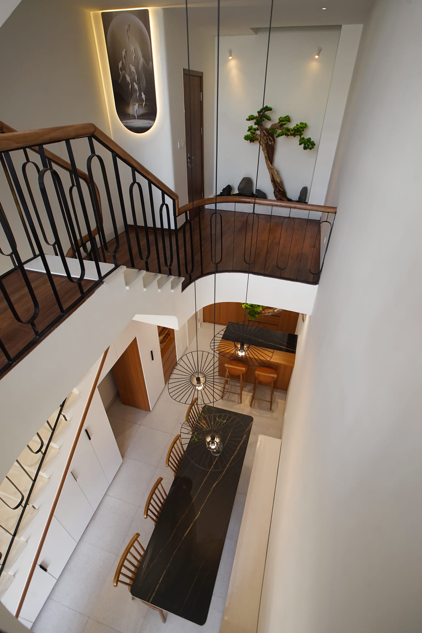Khoảng thông tầng được gắn thêm đèn chùm cho đỡ trống trải và tạo điểm nhấn. Ánh sáng được sử dụng sắc độ vừa phải, đủ sáng cho mọi sinh hoạt chung vào buổi tối nhưng không chói gắt, gây khó chịu cho thị giác.
