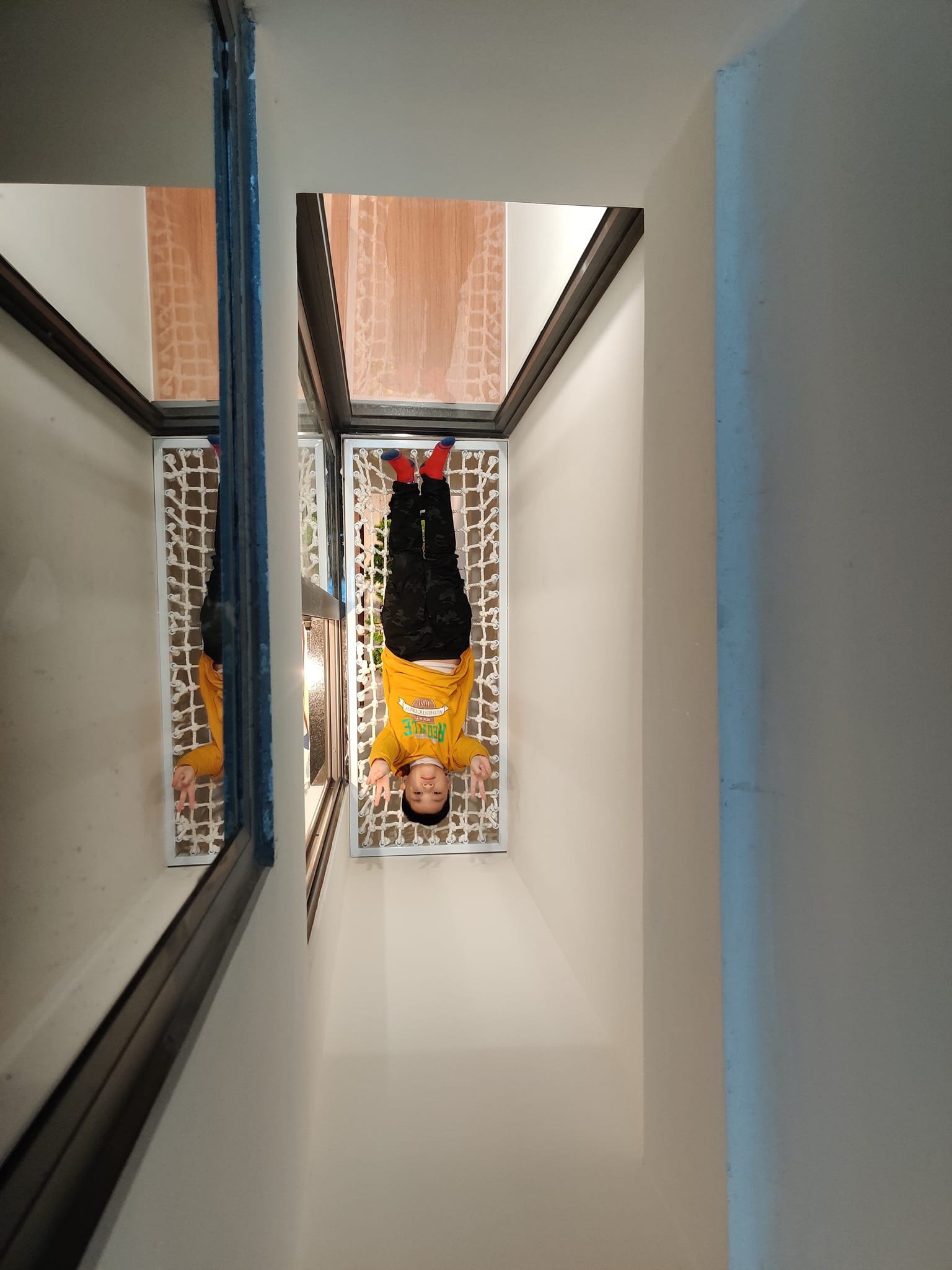 Giếng trời nhìn xuống võng lưới phòng bé trai. Khung cửa kính rộng thay tường là ý tưởng tốt cho những ngôi nhà có diện tích hẹp như thế này.