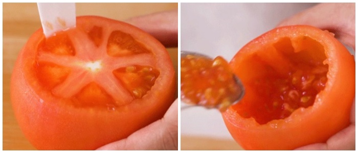 - Cà chua rửa sạch, cắt bỏ đầu trên, dùng thìa múc hết thịt cà chua bên trong ra.