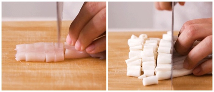 - Nấm rửa sạch, thái nhỏ. Mực làm sạch thái miếng nhỏ. Tôm bóc vỏ, bỏ chỉ đen.
