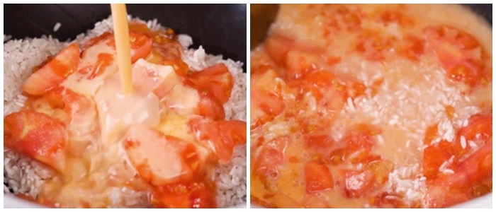Cho gạo đã vo sạch, cho phần thịt cà chua vào cùng với một nửa chỗ nước sốt gia vị đã hòa bên trên vào, trộn đều.