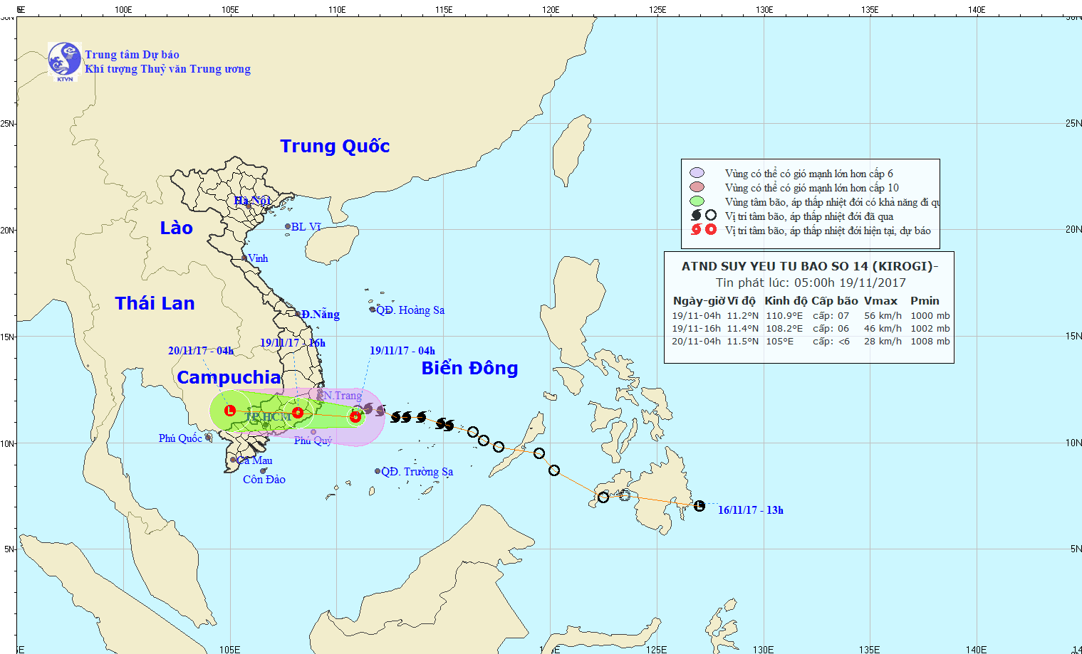 Trung tâm dự báo khí tượng thủy văn Trung ương cho biết hồi 4h, tâm áp thấp nhiệt đới trên vùng biển các tỉnh Khánh Hòa - Bình Thuận với sức gió tối đa 60km/h, giật cấp 9. Vùng gió mạnh do áp thấp nhiệt đới trên cấp 6, gió giật mạnh cấp 9 có bán kính 100 km về phía Bắc và 80 km về phía Nam tính từ vùng tâm áp thấp nhiệt đới.