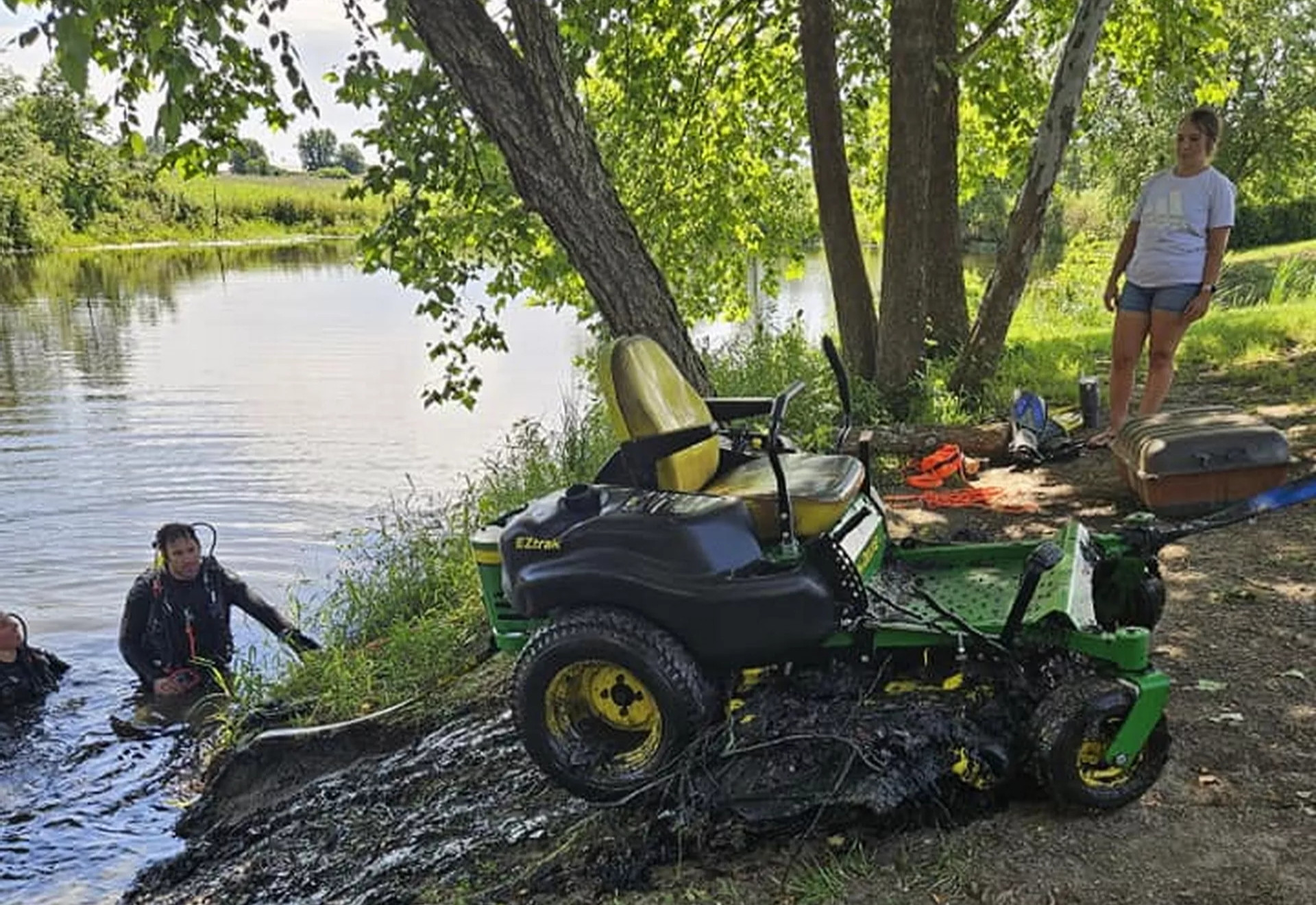 Anh kể: “Mưa đã kéo dài liên tục trong suốt cả tuần và bãi cỏ ở sân sau nhà tôi ngày càng cao. Vì vậy, tôi quyết định cắt cỏ bằng máy cắt cỏ John Deere của mình ngay sau khi trời vừa tạnh mưa. Nhưng có lẽ là do khoảng cách quá sát với bờ ao nên máy đã trượt xuống mép nước. Tôi đã quyết định kéo chiếc máy cắt cỏ bằng xe bán tải và móc dây nối vào cản sau của xe. Thế nhưng mặt đất vẫn quá trơn và bánh xe dần mất kiểm soát. Cứ thế chiếc xe trôi dần xuống áo, bất chấp việc tôi cố cứu nó bằng cách mở cửa xe lao ra tìm khúc gỗ để chặn bánh sau. Cuối cùng chiếc xe chìm khoảng 3 mét so với mặt nước."