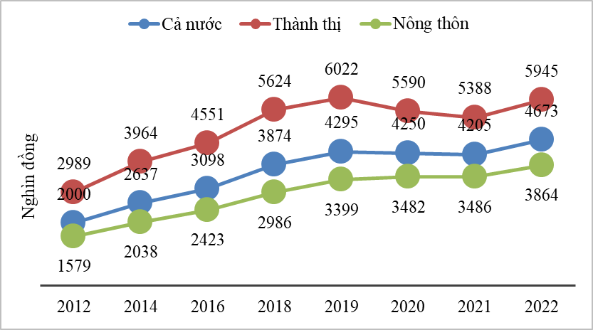 Thu nhập ở thành thị đạt gần 6 triệu đồng, tăng 10,4% so với năm 2021. Mức này cao gấp 1,54 lần nông thôn (3,86 triệu đồng/tháng).