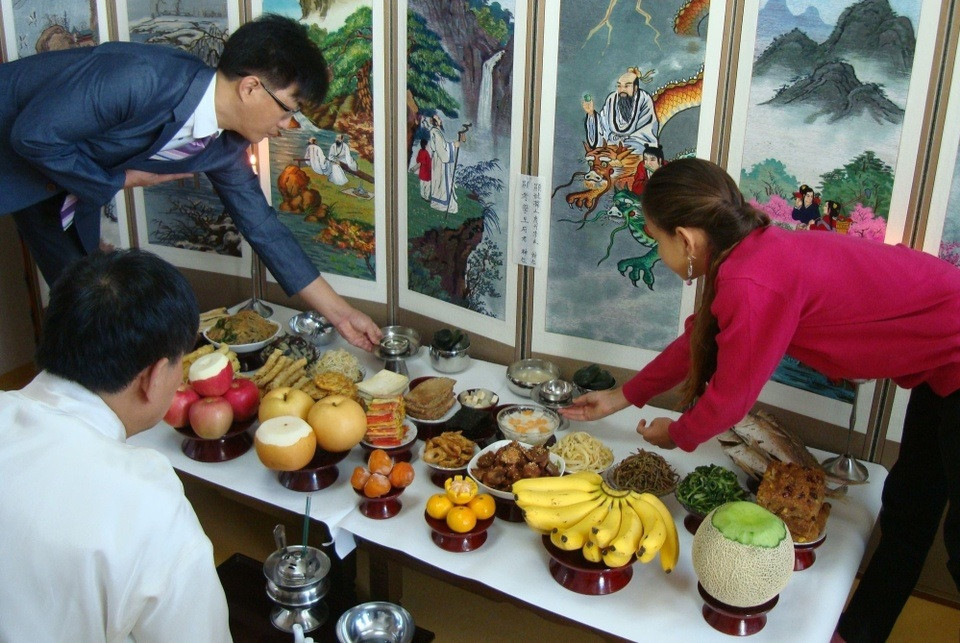 Tại Hàn Quốc, mâm thức ăn cúng thường gồm nhiều món, chuẩn bị cầu kỳ nên tốn không ít công sức. Ngoài hoa quả, canh bánh gạo, mâm cúng không thể thiếu rau củ chiên, thịt bò, cá, rau rừng, miến trộn...