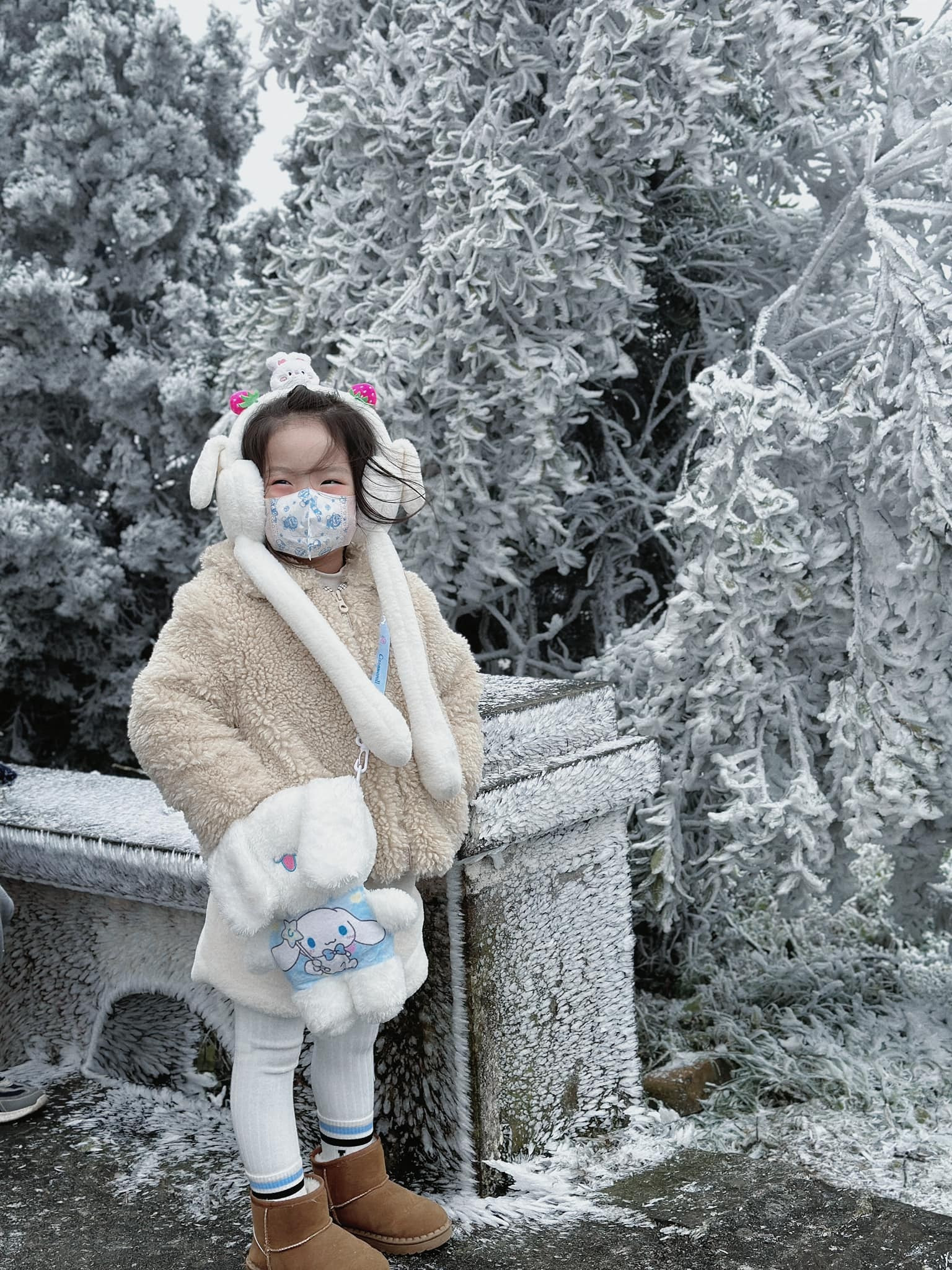 Với kinh nghiệm du lịch của mình, chị Hồng Anh luôn trang bị đầy đủ găng tay, áo ấm, mũ, bịt tai, miếng dán giữ nhiệt... cho con gái và cả gia đình. "Cháu mặc ấm lắm. Cháu thích thú chạy nhảy ầm ầm, còn kêu nóng ấy", chị Hồng Anh nói.