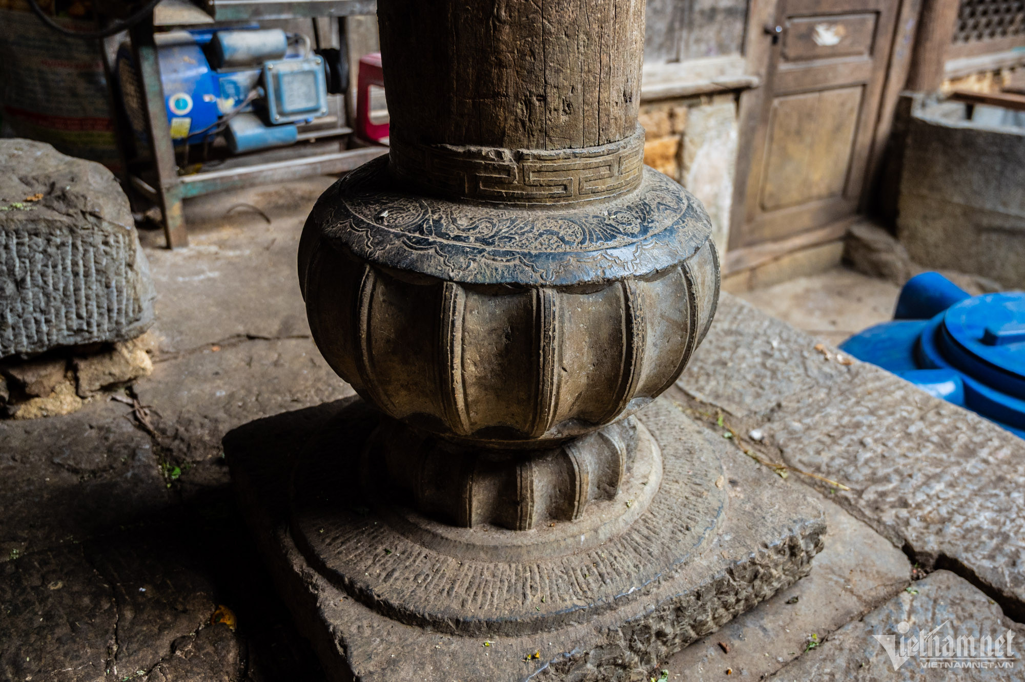 Cửa chính ngôi nhà làm bằng gỗ với ngạch cửa cao, một kiến trúc quen thuộc với đồng bào Mông. Hai khối đá lớn vuông vức dưới chân trụ cổng được khắc hoa văn kỳ công không còn rõ họa tiết do thời gian. Đặc biệt, mái hiên cổng lợp ngói âm dương được chạm khắc tinh xảo, có tính thẩm mỹ cao.