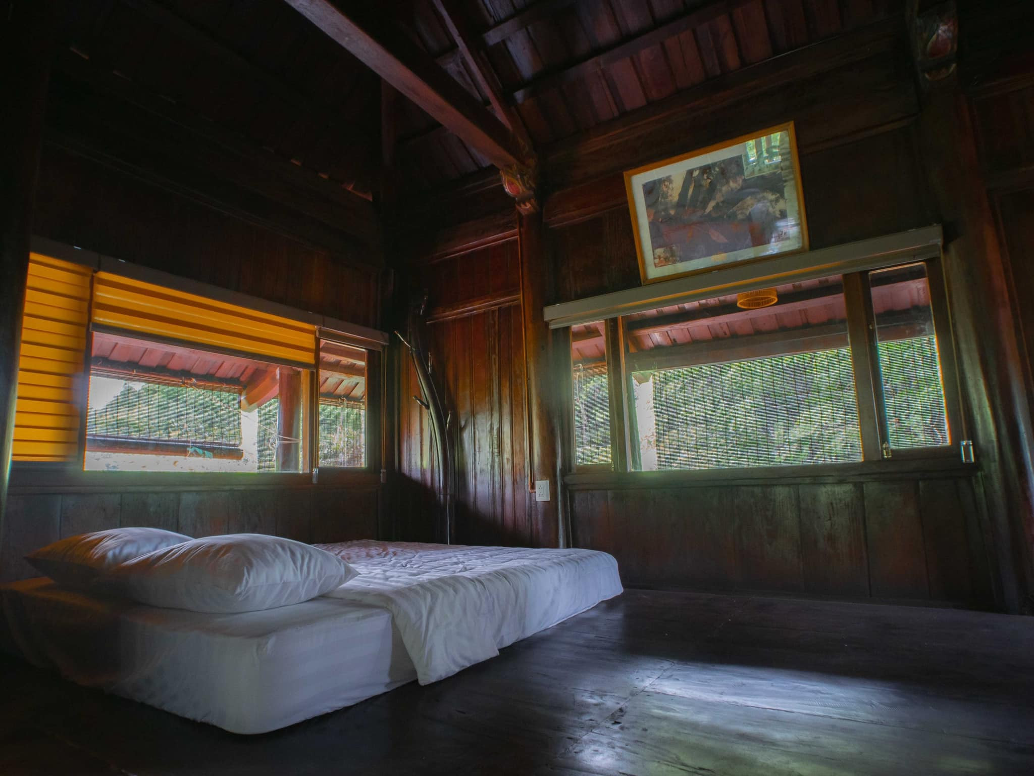 Tầng 2 có phòng ngủ lớn, cũng là không gian sinh hoạt chung của cả nhà. Phần này anh giữ nguyên bản, chỉ kê thêm giường. Từ đây có thể phóng tầm mắt nhìn ra đồi núi và khoảng vườn trồng rau sạch cho 4 mùa.