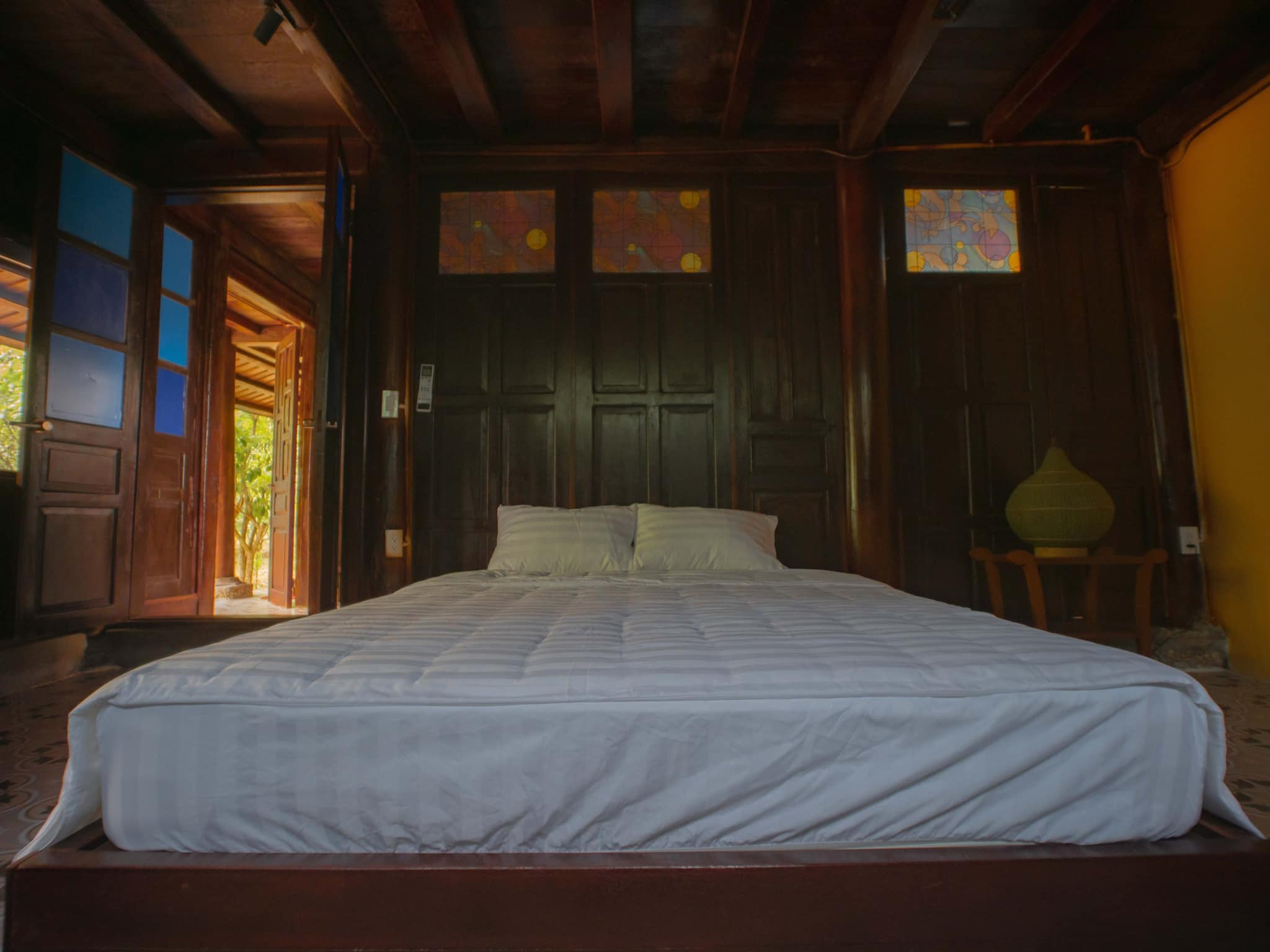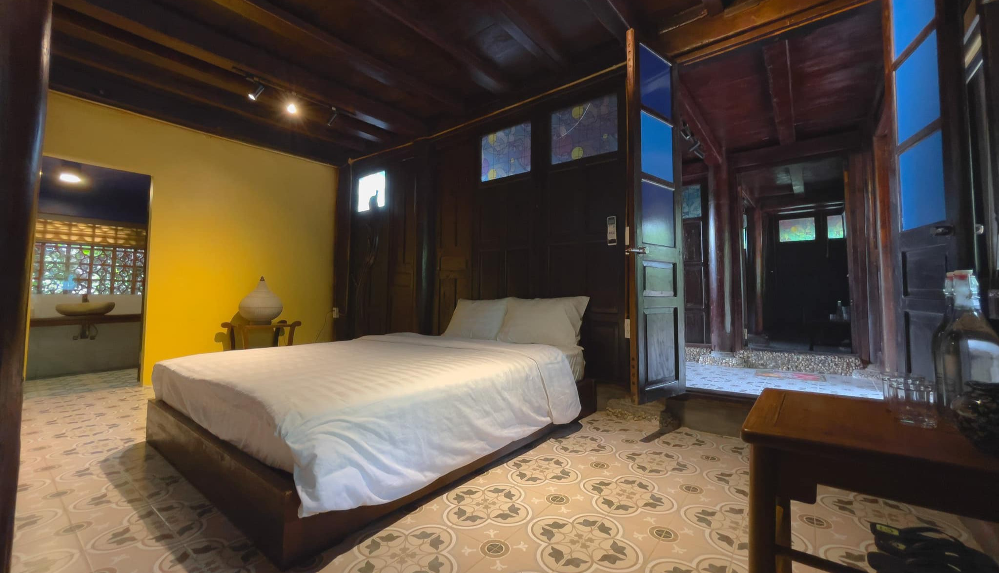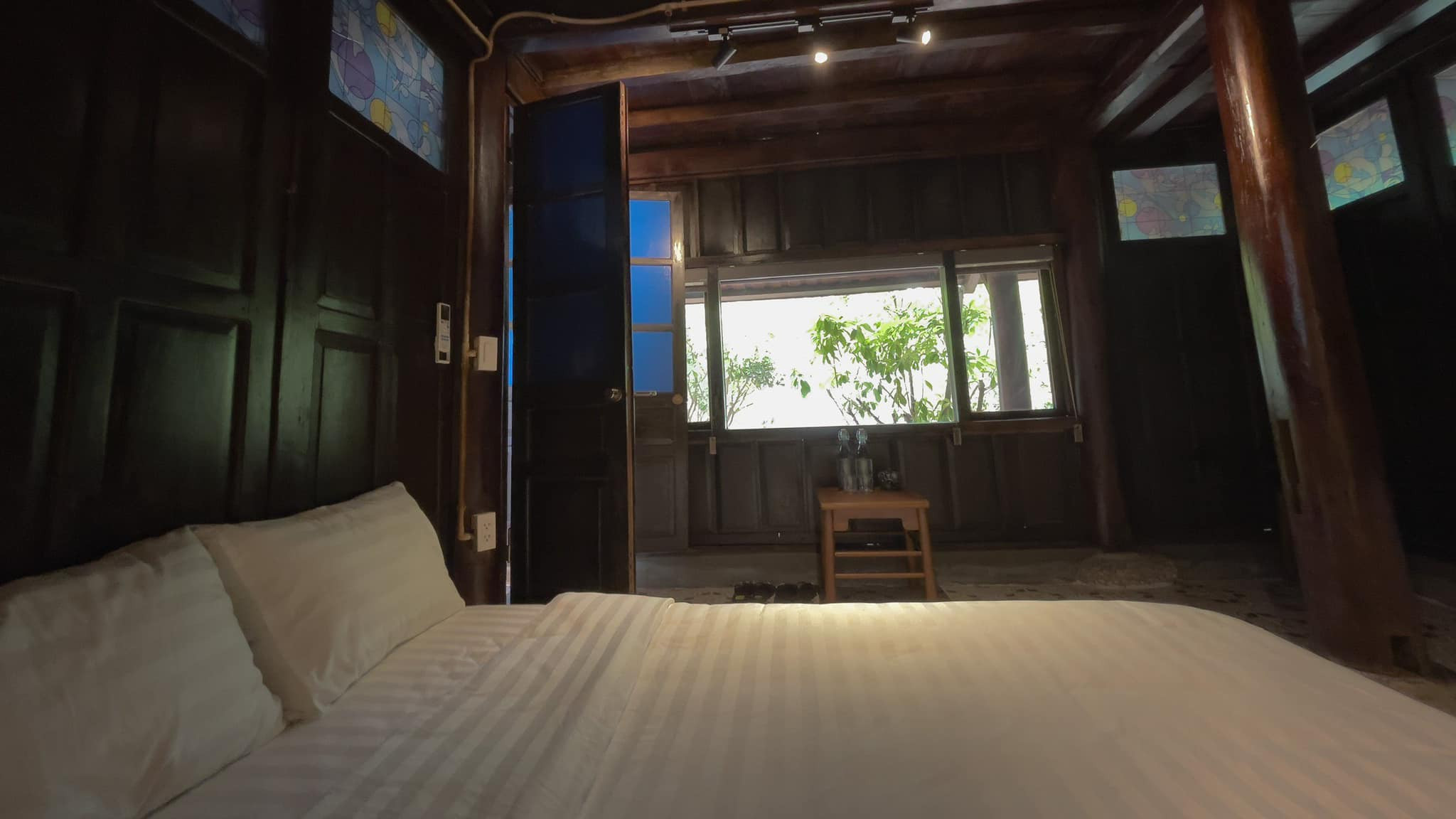 Phòng ngủ tầng 1 với lối ra sân vườn thoáng đãng. Không khí ở Lương Sơn mát mẻ, trong lành nên mỗi buổi sáng thức dậy, anh Kiên và mọi người luôn tràn đầy năng lượng tích cực.