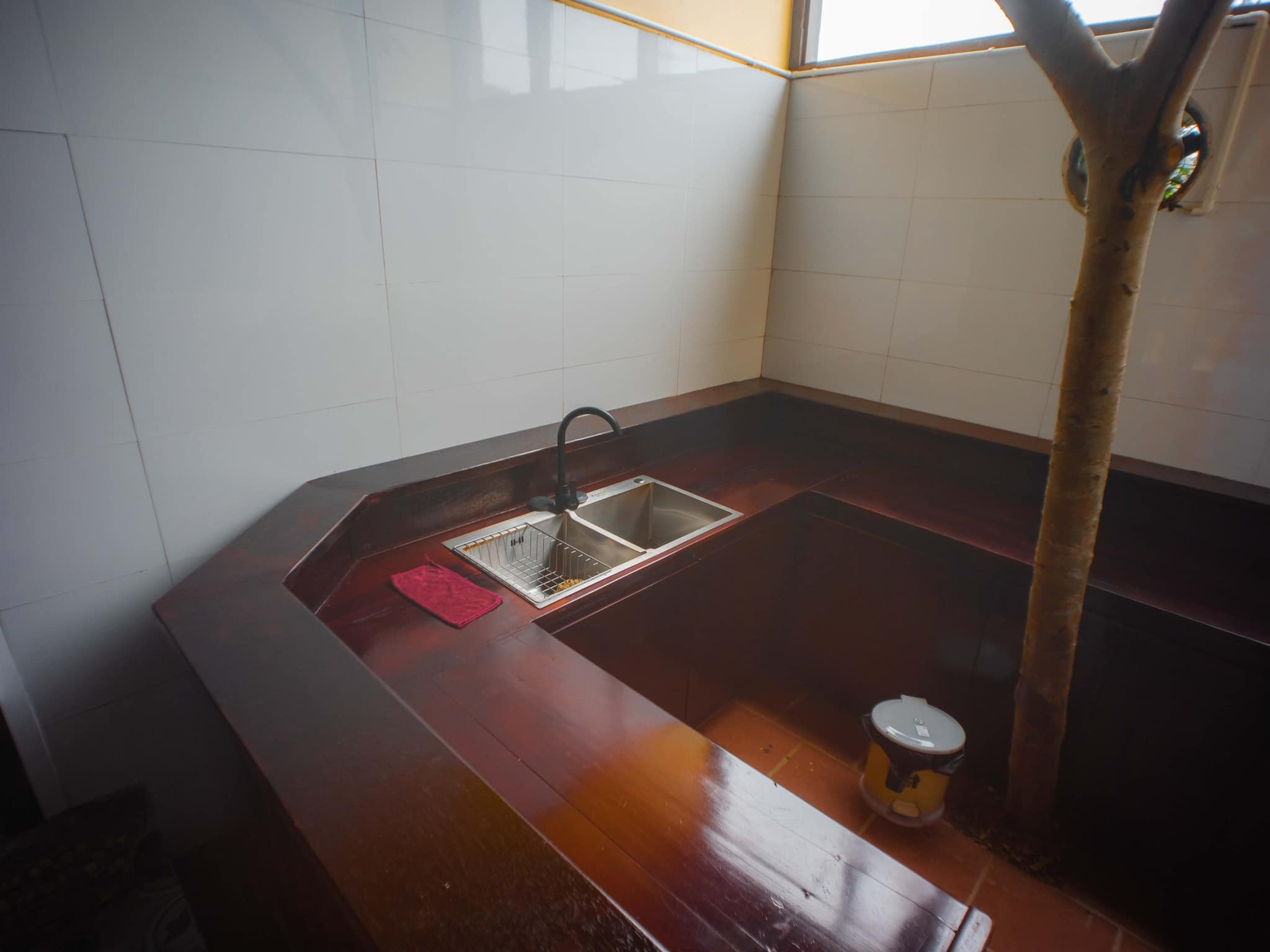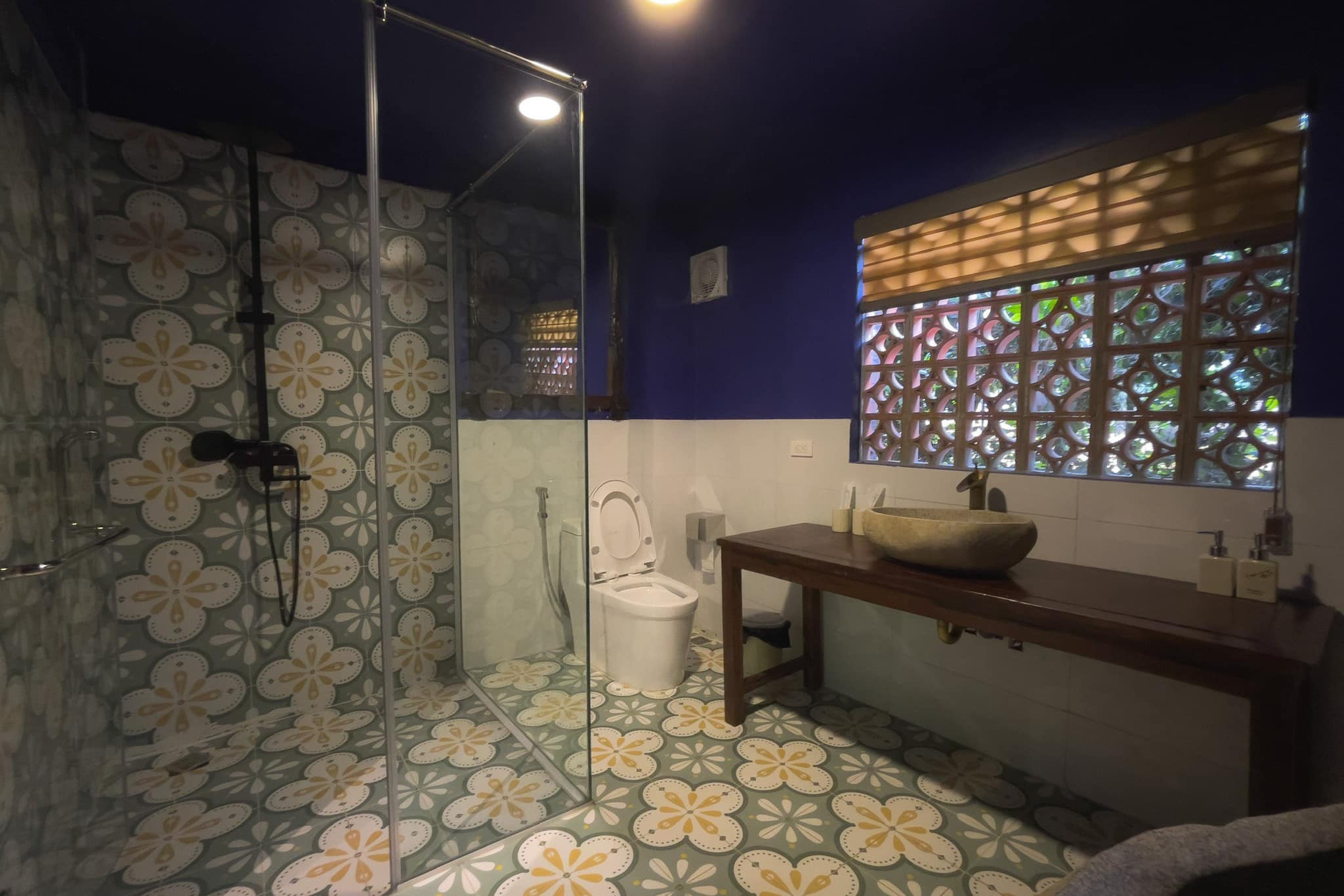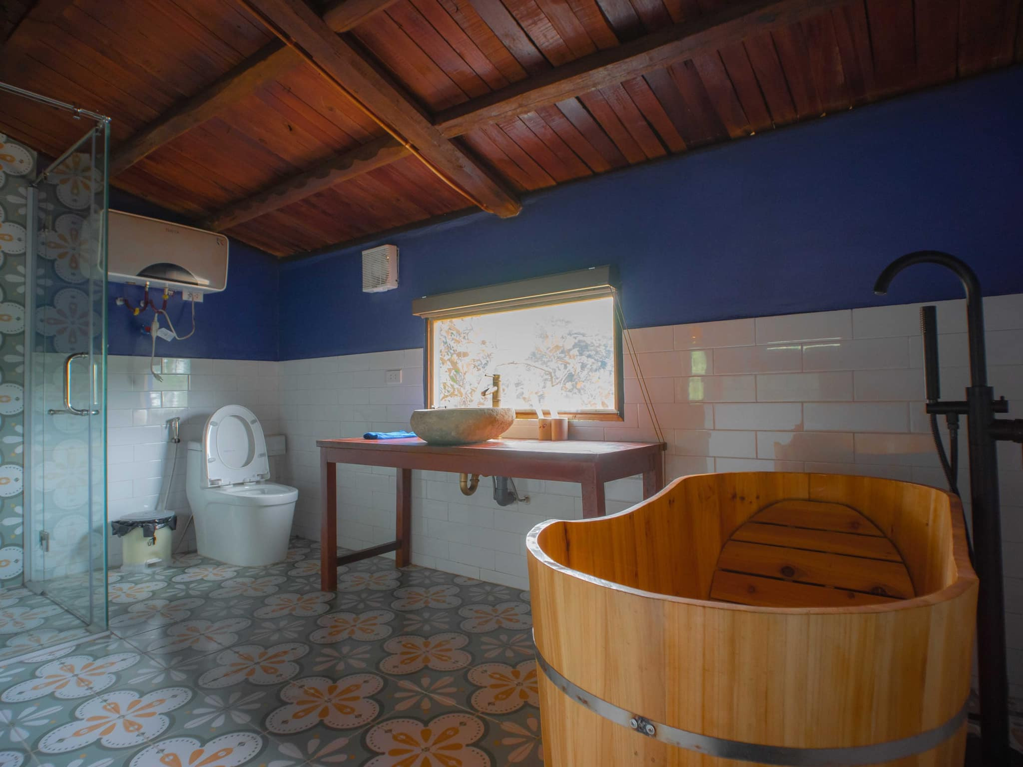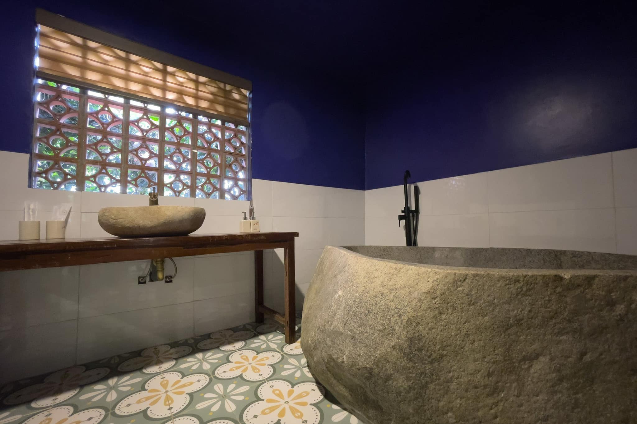 Hai phòng tắm ở 2 tầng. Mỗi phòng đều có bồn ngâm cỡ lớn, phục vụ nhu cầu ngâm thuốc bắc, thảo dược khi cần thư giãn của gia chủ. Bồn tắm bằng đá nguyên khối được anh Kiên cho mài nhẵn, bóng bên trong, đảm bảo an toàn khi sử dụng. Loại bồn này dùng vào mùa hè đặc biệt mát lạnh, dễ chịu, còn dùng nước nóng giữ nhiệt khá lâu.
