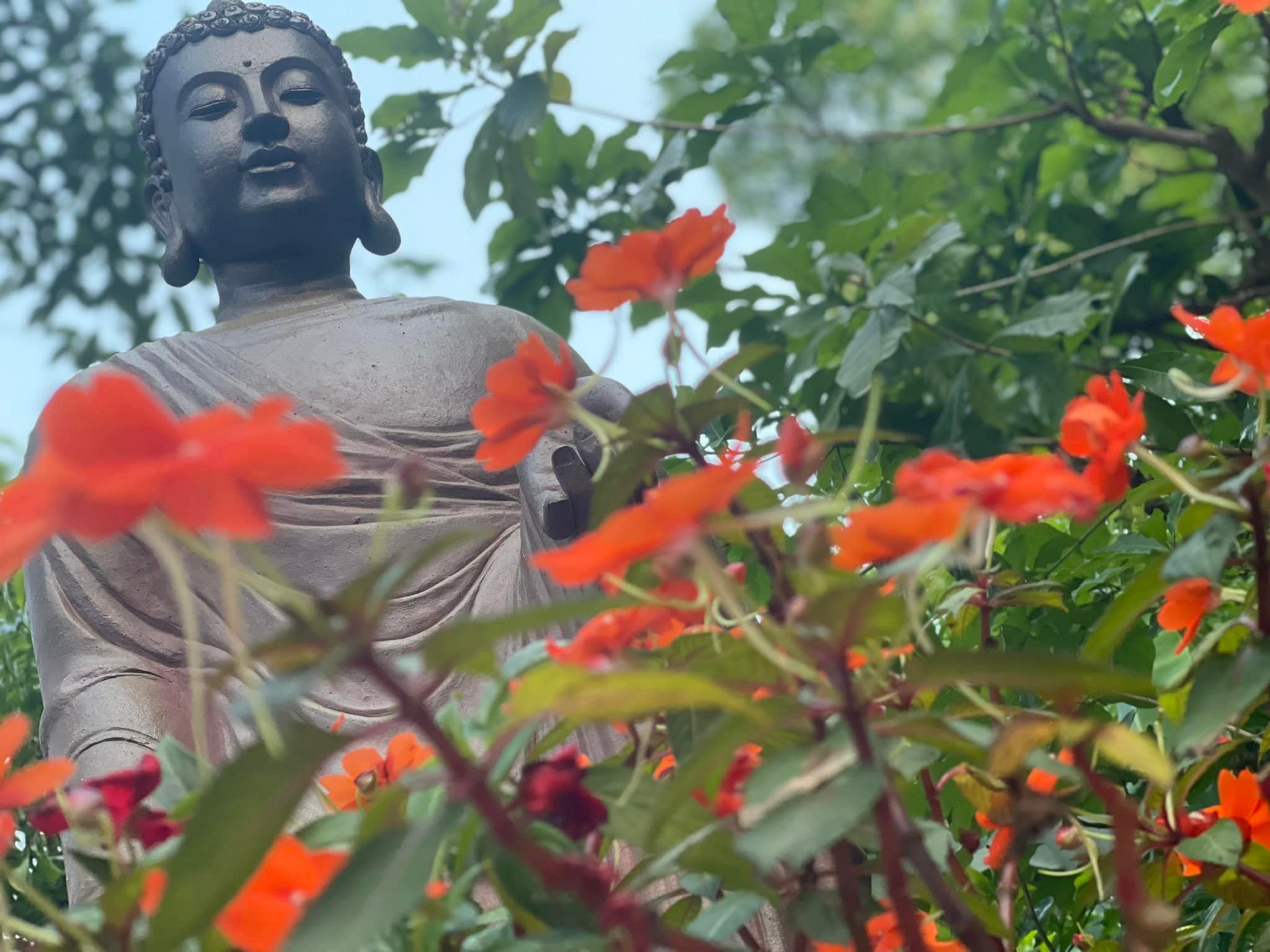 Cảnh quan xung quanh nhà sàn có cả yếu tố tâm linh và yếu tố nghỉ dưỡng mát mẻ. Hệ sinh thái đa dạng, trăm hoa đua nở, thu hút ong, bướm và chim chóc về làm tổ.