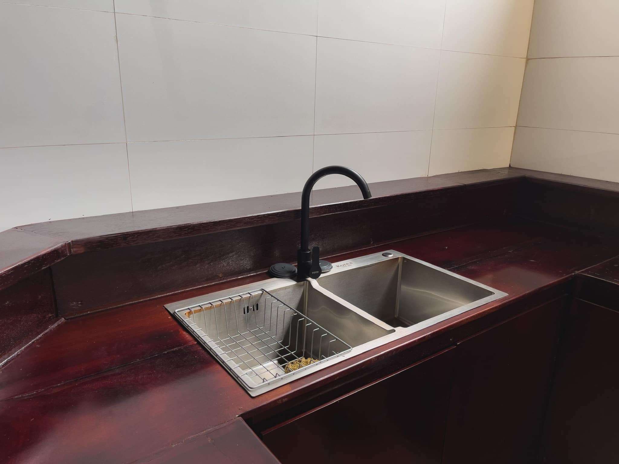 Phòng bếp đơn giản, hình chữ U, thuận tiện khi nấu những món đơn giản, còn khi cần tiệc lớn, đông người, anh Kiên sẽ sử dụng khu bếp khác.
