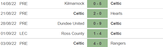 Celtic toàn thắng 6 trận đấu giải vô địch Scotland, với 25 bàn thắng được ghi và chỉ lọt lưới 1 bàn. Ấn tượng nhất là trận thắng đối thủ truyền kiếp Rangers 4-0.