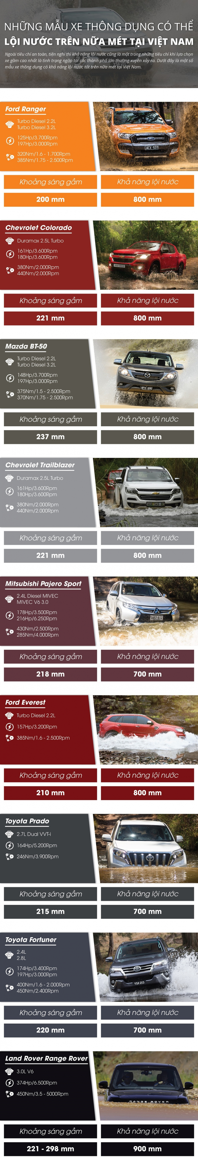 Dưới đây là một số mẫu xe thông dụng có khả năng lội nước tốt trên nửa mét tại Việt Nam.