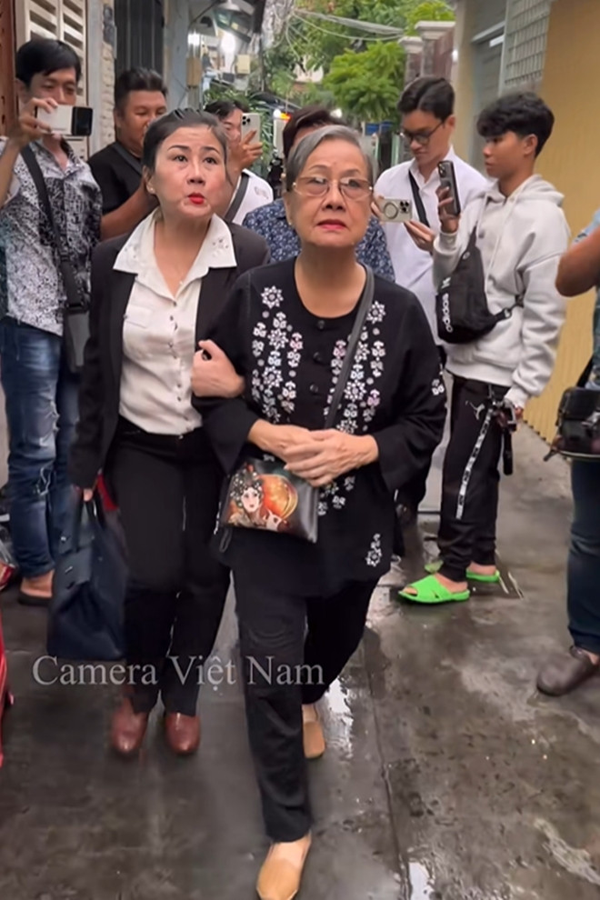 NSND Thoại Miêu - một trong những gương mặt kỳ cựu của cải lương Nam Bộ đến thắp hương và chia sẻ với gia đình nghệ sĩ Bùi Công Tài chiều ngày 18/7.