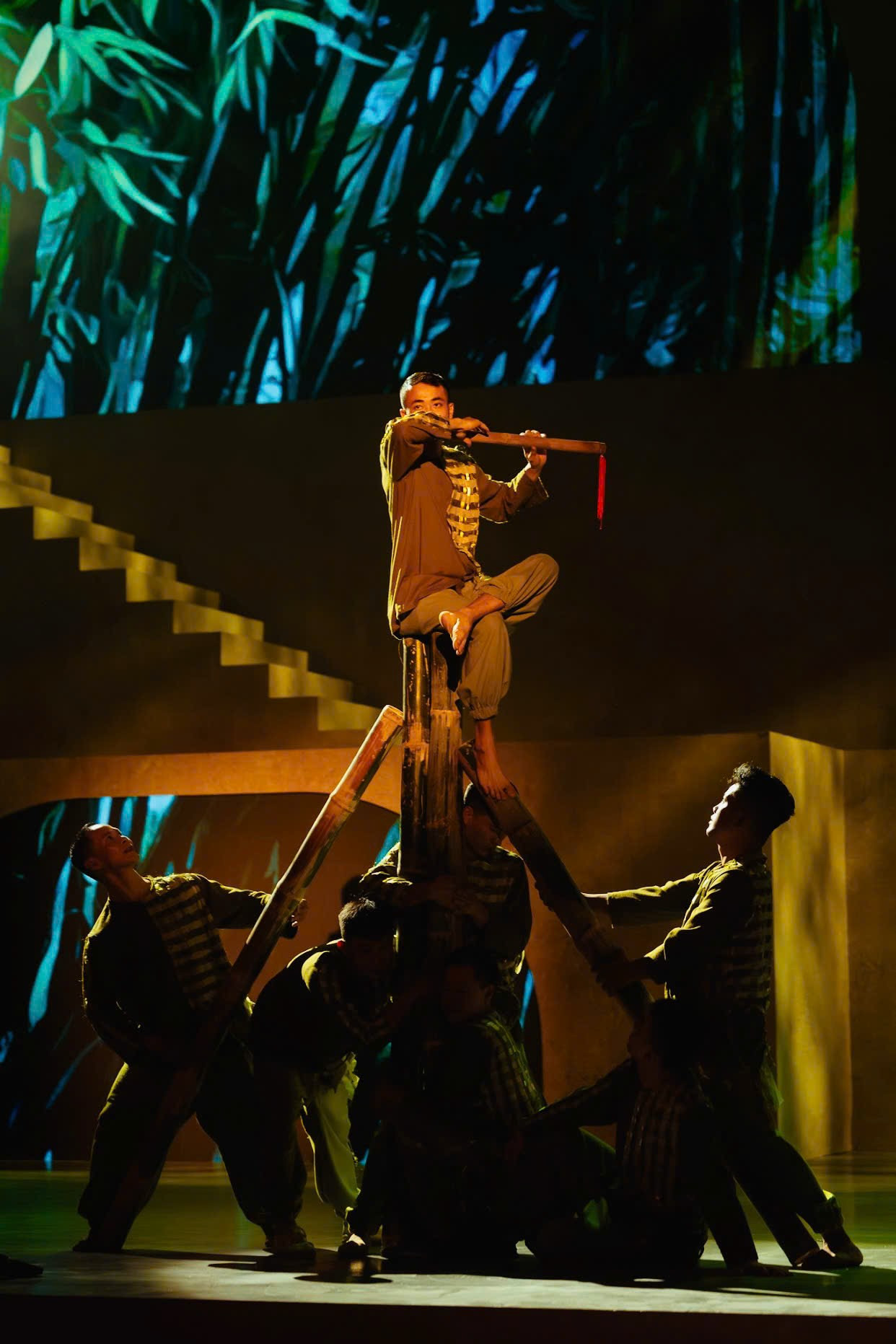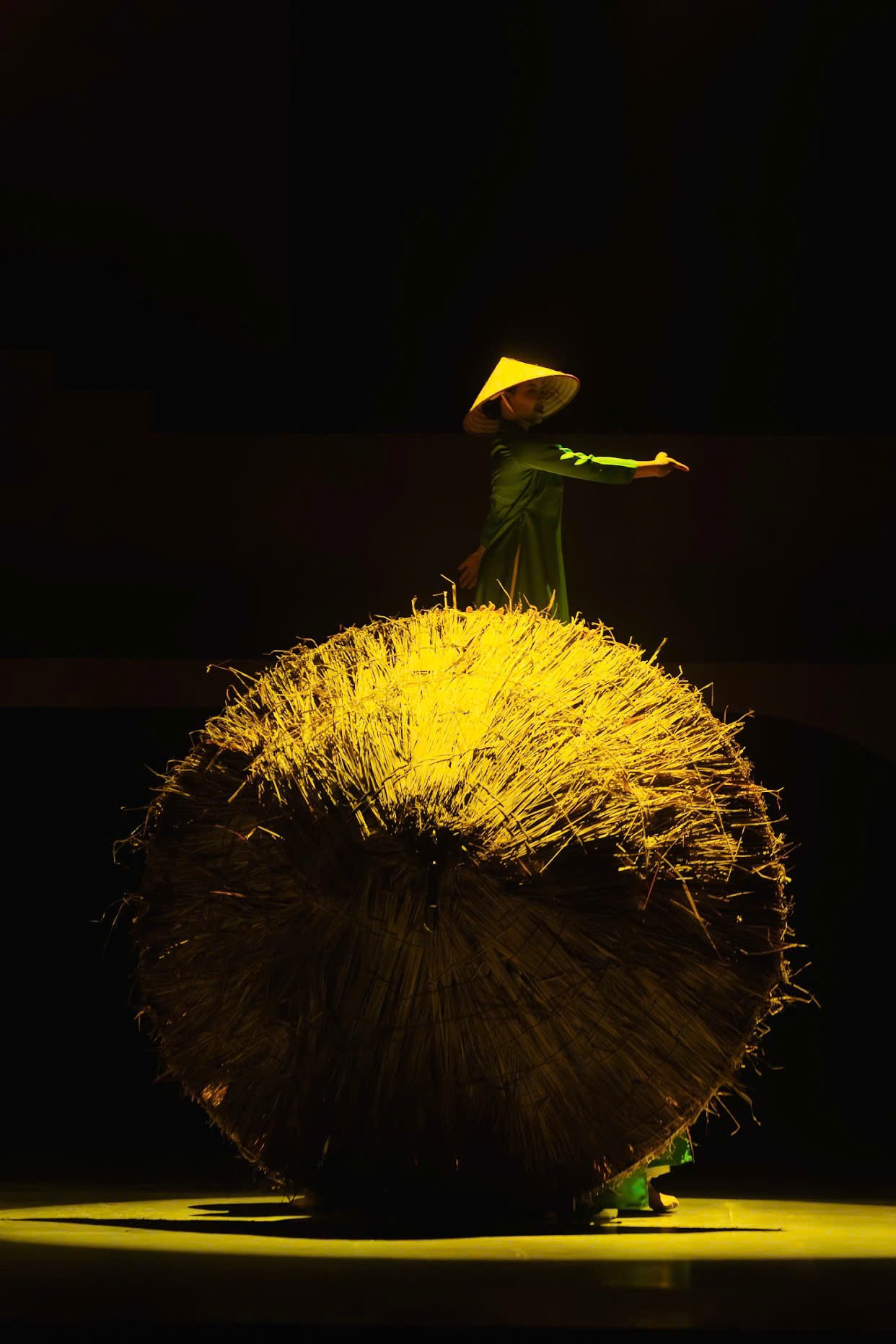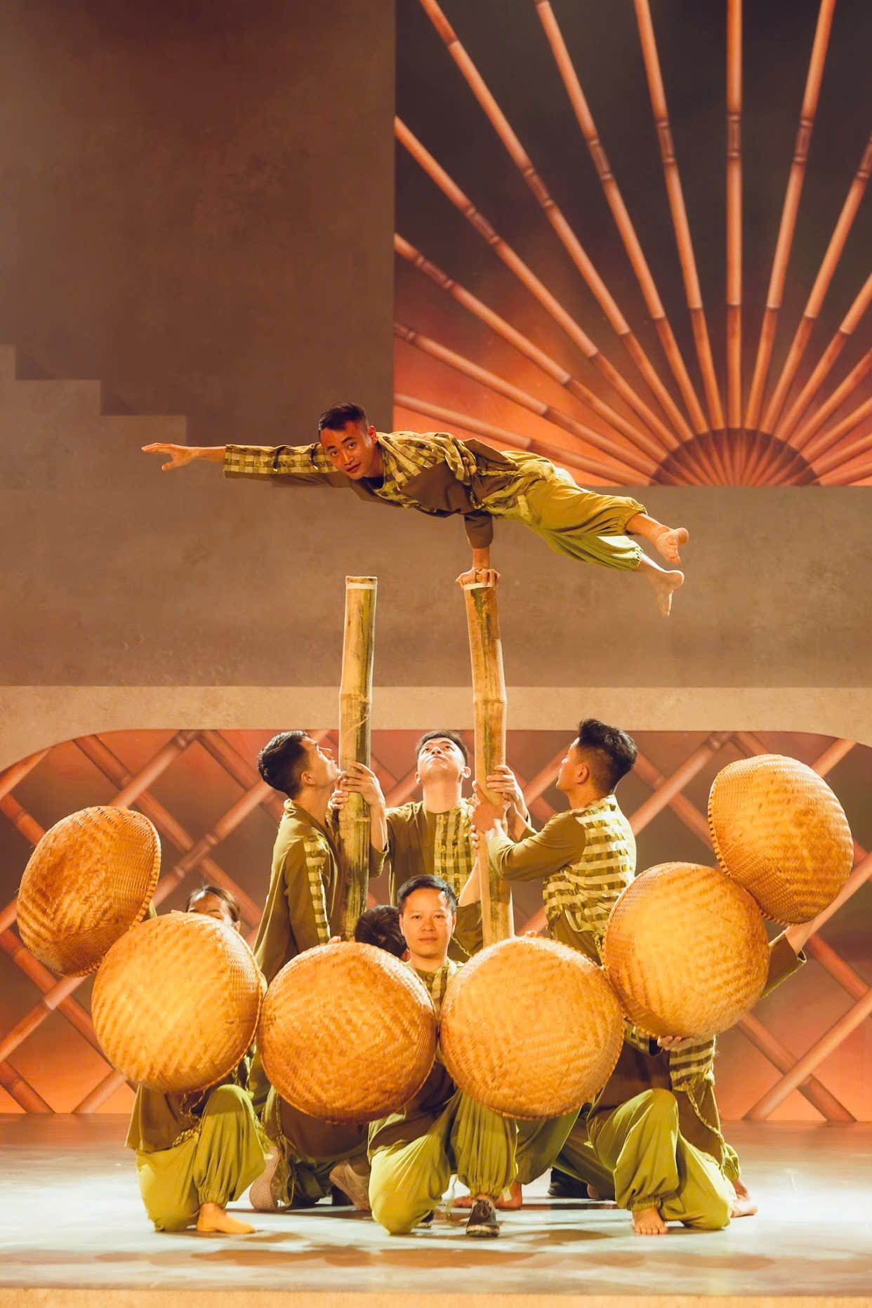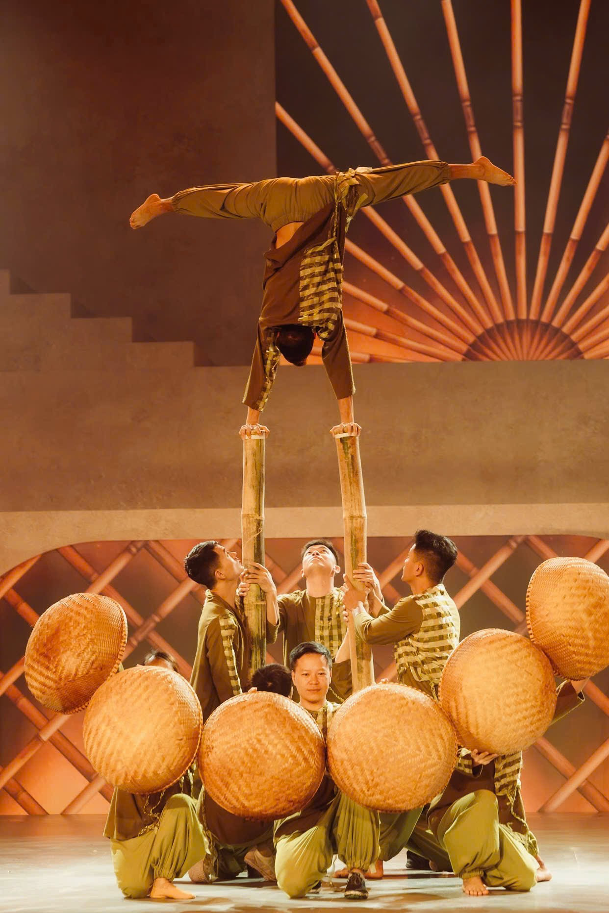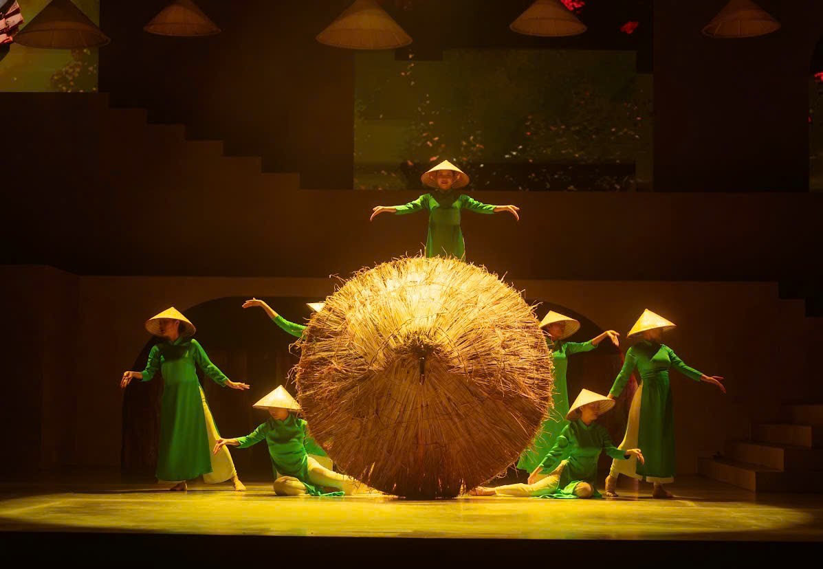 Màn trình diễn tôn vinh nghề đan nón là minh chứng rõ nét cho sự phối hợp ăn ý giữa đạo cụ sân khấu và ngôn ngữ hình thể. Chiếc nón lá lớn dần hiện ra như một biểu tượng văn hóa Việt, kết hợp cùng màn nhào lộn uyển chuyển, tạo thành một khoảnh khắc thơ - nơi chất liệu truyền thống và ngôn ngữ biểu diễn đương đại hòa quyện một cách đầy sáng tạo.