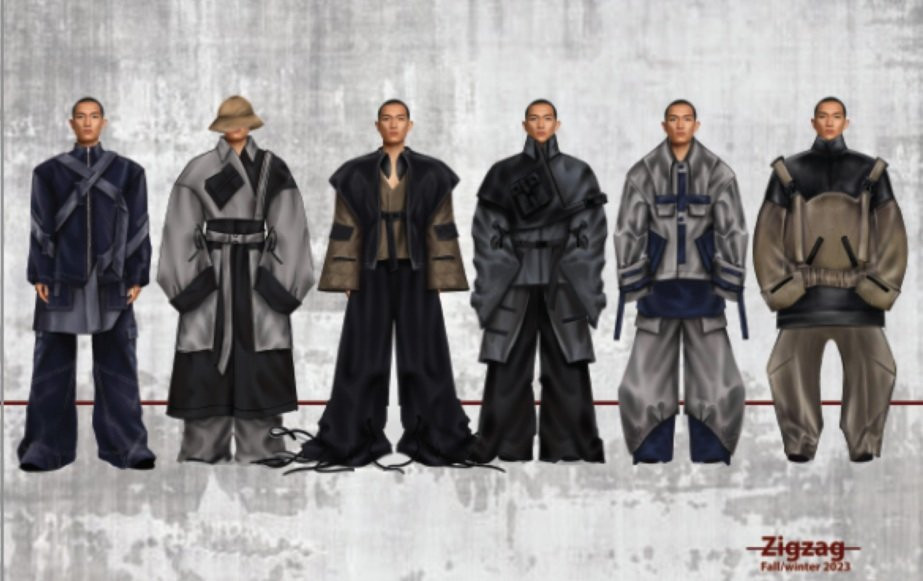 BST thời trang nam của tôi mang tên ZigZag có chất liệu chủ đạo là denim, denim chần bông kaki chần bông. Thiết kế lấy cảm hứng từ trang phục thường ngày của nam giới những năm 1940 ở London kết hợp với chi tiết như dây điện, mạng nhện, ô gạch zigzag, hình ảnh đặc trưng đường phố Việt Nam”.