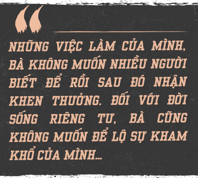 Khi chúng tôi ngỏ ý muốn ghi lại hình ảnh bữa ăn của bà, bà quyết liệt từ chối. Bà nói những việc làm của mình, bà không muốn nhiều người biết để rồi sau đó nhận khen thưởng. Đối với đời sống riêng tư, bà cũng không muốn để lộ sự kham khổ của mình…