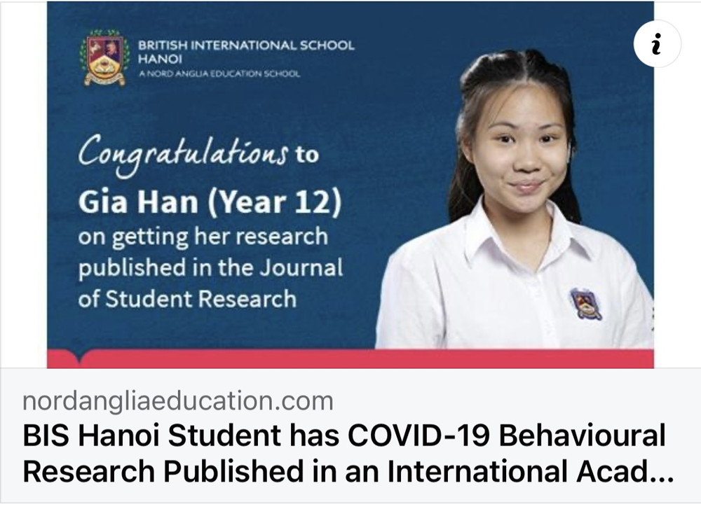 Vì vậy ngoài SCG, Gia Hân còn dành thời gian nghiên cứu khoa học. Đầu năm nay, bài nghiên cứu của em về các biện pháp an toàn thúc đẩy doanh nghiệp Việt Nam trong đại dịch (A Behavioural Perspective on Vietnam's Corporate Safety Measures and Nudges in COovid-19) đã được đăng trên Tạp chí Nghiên cứu Sinh viên (Journal of Student Research). Đây là tạp chí học thuật uy tín nhằm giới thiệu các bài nghiên cứu của học sinh trung học, sinh viên đại học và sau đại học trên khắp thế giới. Thầy Chris Newman, Hiệu phó khối Trung học tại BIS Hà Nội, đánh giá thành quả của Gia Hân vượt xa so với mục tiêu ban đầu.
