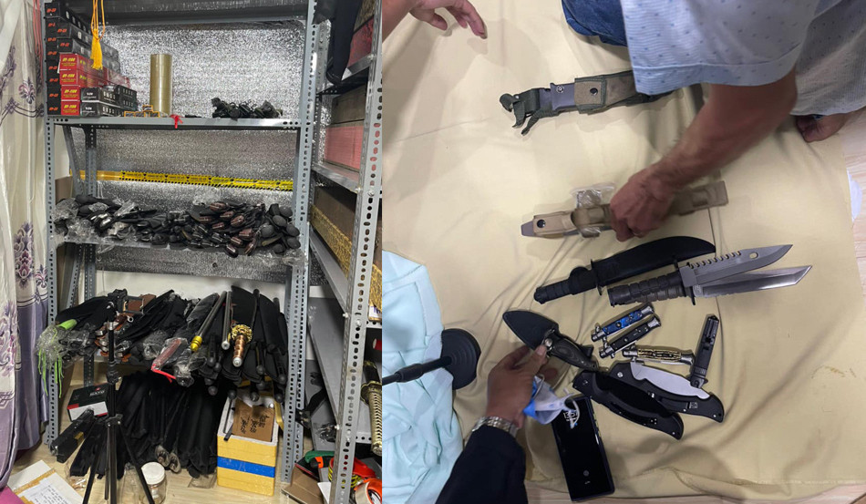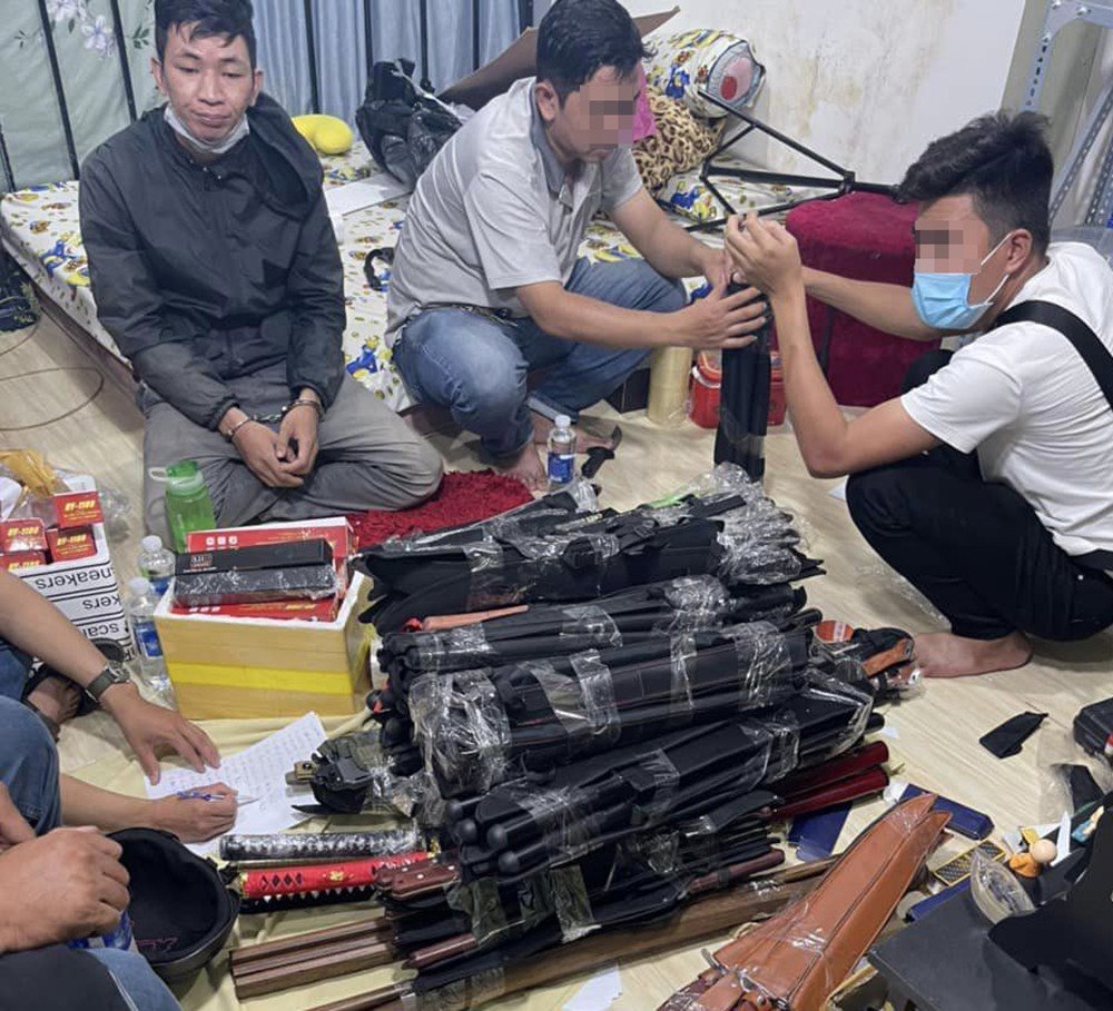 Khám xét nơi ở của Vũ, công an đã thu giữ lượng tang vật gồm: 232 đao kiếm các loại, 23 roi điện và nhiều hộp để đựng dao kiếm.