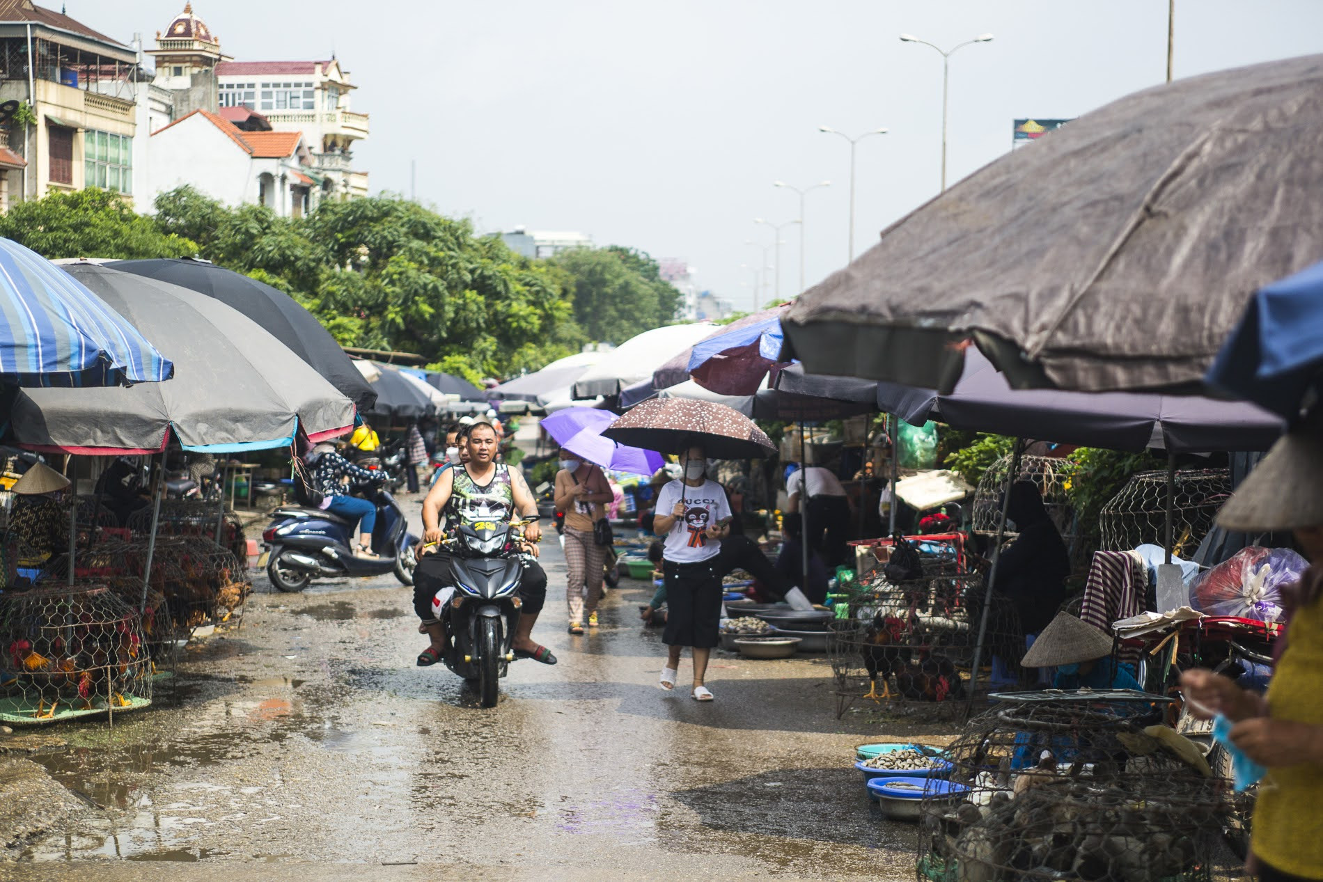 Mặc kệ xe ô tô lao vun vút trên Quốc lộ 5, chỉ cách đúng hàng rào hộ lan có người bán, người mua nườm nượp sát bên. Hai bên đường hàng chục gian hàng được bày bán đủ loại thực phẩm: thịt, cá, hải sản, rau, hoa quả…