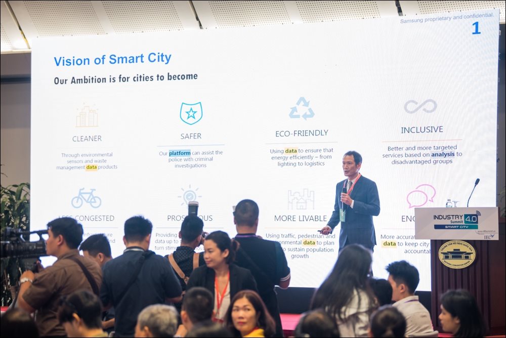 Tại hội thảo chuyên đề “Xây dựng đô thị thông minh trong tiến trình chuyển đổi số Quốc gia”, dựa trên kinh nghiệm nhiều năm triển khai những giải pháp thông minh ở hơn 1.200 khu vực trên toàn thế giới của Samsung, đại diện Samsung Vina chia sẻ và giới thiệu các sản phẩm và giải pháp cho thành phố thông minh: