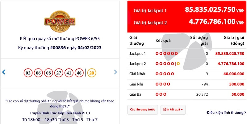 Hiện Jackpot 1 của Power 6/55 đang thu hút sự quan tâm của nhiều người chơi. Từ con số 30 tỷ đồng khởi điểm, giá trị Jackpot này đã tăng lên hơn 85 tỷ đồng sau nhiều kỳ quay vô chủ. Với mức tăng hơn 6 tỷ đồng ở kỳ quay gần nhất, Jackpot 1 - Power 6/55 được dự báo sẽ vượt 90 tỷ đồng ngay trong kỳ quay #00837 mở thưởng tối 7/2.