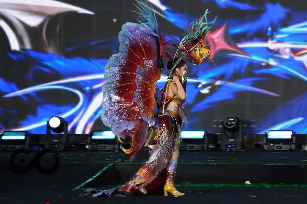 Hoa hậu Phương Linh loạng choạng diễn với trang phục cồng kềnhPhương Linh chật vật trình diễn bộ trang phục ''Cá chép hóa rồng'' tại Carnival show của Miss Cosmo 2025 trong điều kiện gió mạnh, lạnh 14 độ C ở Đà Lạt.