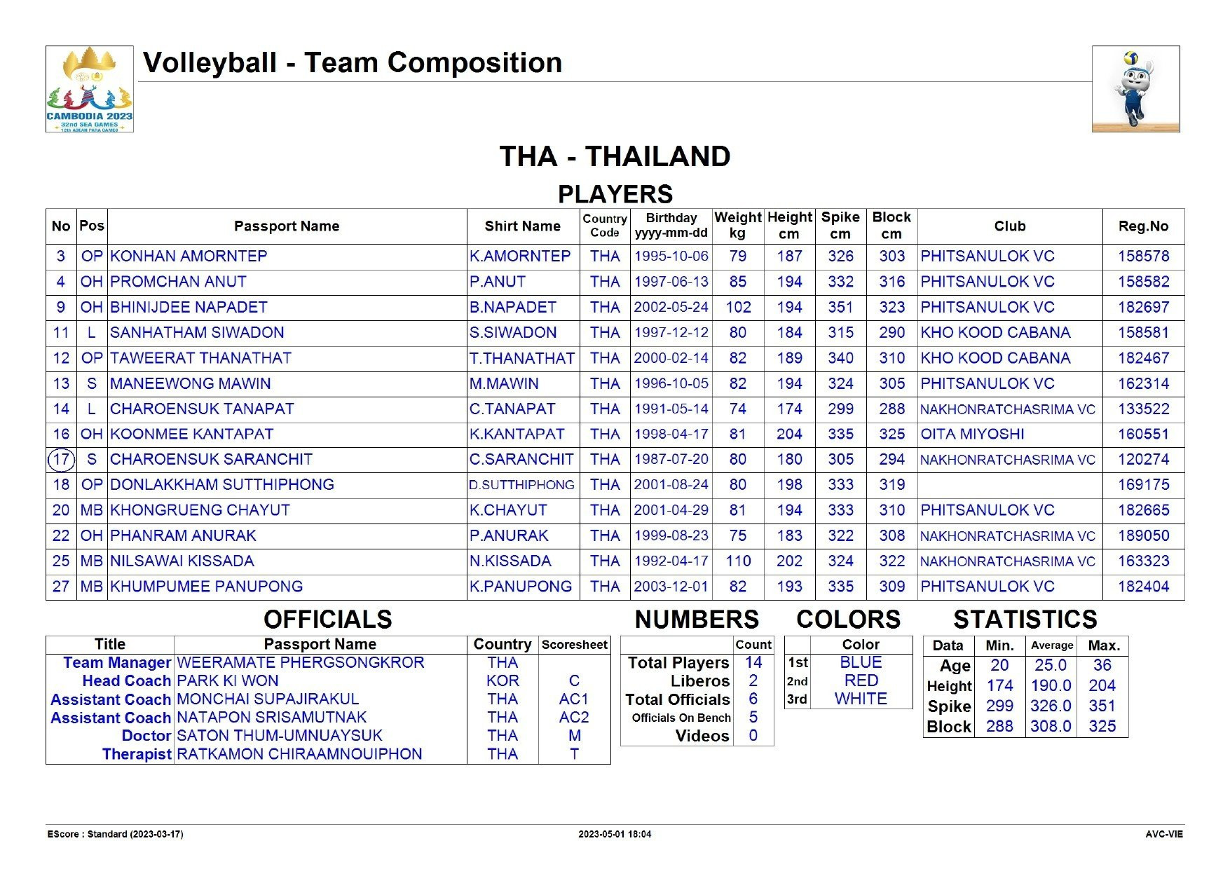 Bên kia chiến tuyến, bóng chuyền nam Thái Lan có tới 7 VĐV mới so với Đại hội trước. Những cái tên mới tại SEA Games năm nay là Thanathat Thaweerat, Tanapat Charoensuk, Sutthiphong Donlakkham, Saranchit Charoensuk, Panupong Khumpumee, Kantapat Koonmee và Chayut Khongrueng.