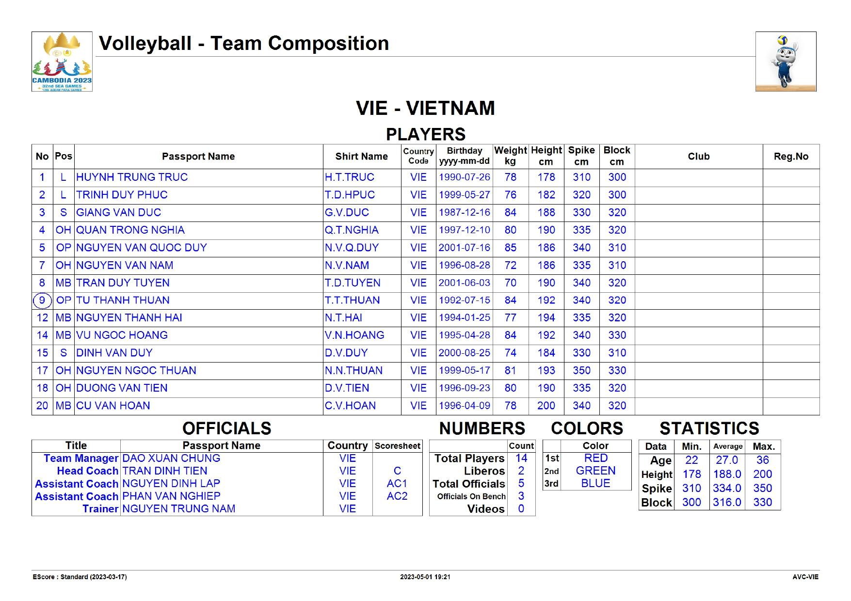 Về lực lượng, đội tuyển bóng chuyền nam Việt Nam đã thay đổi 4 gương mặt trong danh sách chính thức so với SEA Games 31. Những tuyển thủ như Phạm Thái Hưng, Lâm Văn Sanh, Nguyễn Xuân Thành, Nguyễn Đình Nhu đã vắng mặt và thay vào đó các gương mặt mới gồm Nguyễn Thanh Hải, Nguyễn Ngọc Thuân, Đinh Văn Duy, Trần Duy Tuyến.