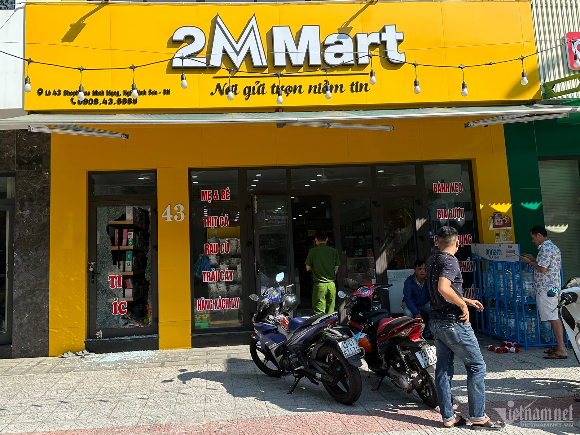 Khoảng 2h30 rạng sáng cùng ngày, cả nhóm dừng xe trước cửa siêu thị 2M Mart lô 43 Shophouse đường Minh Mạng (phường Hòa Qúy), đập cửa kính bên hông rồi vào trong mở cửa chính.