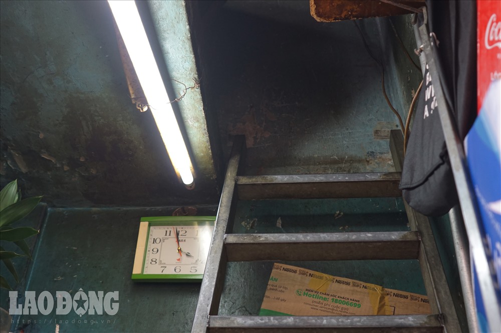 Do căn nhà quá nhỏ, nên bà Vân tận dụng thêm ban công, kéo bạt che chắn và lấy miếng gỗ vuông làm nắp cầu thang, đậy lại là thành chỗ ngủ. |