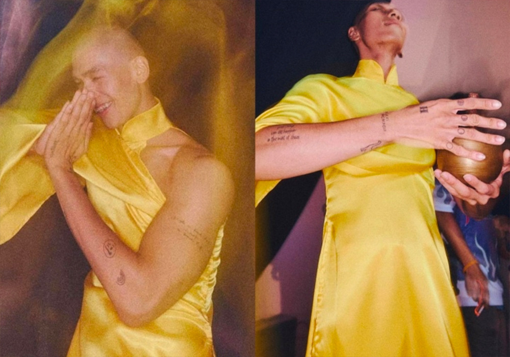 Trong một thiết kế khác, một người mẫu nam để đầu trọc, mặc bộ trang phục màu vàng cổ trụ, tạo dáng bên chiếc chuông vàng. Nhiều thiết kế khác cũng có hình dáng giống áo dài, áo yếm truyền thống nhưng được tạo phom dáng cắt xẻ táo bạo.