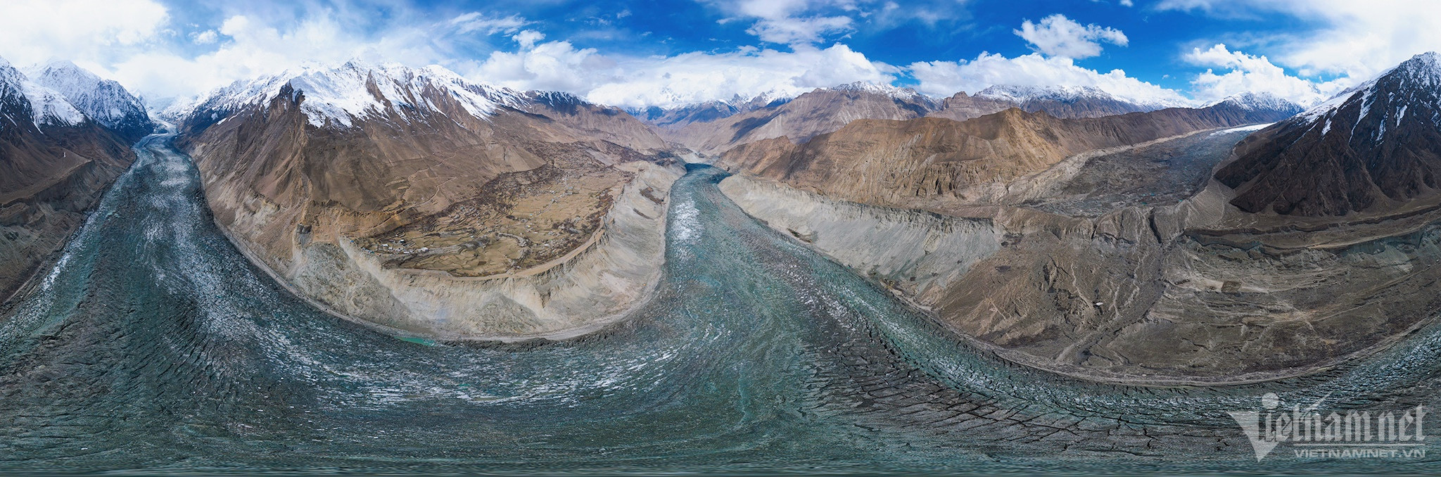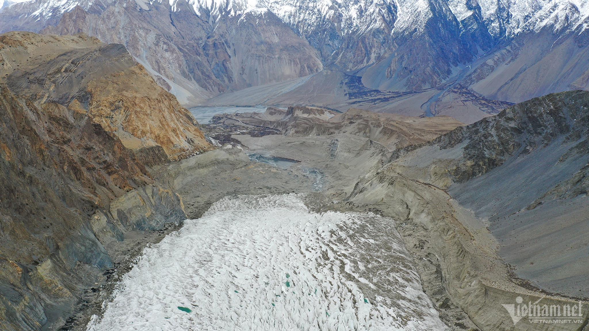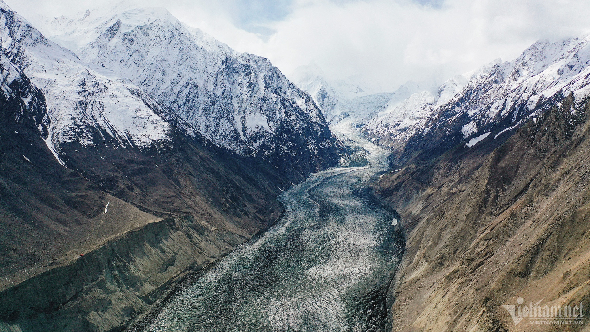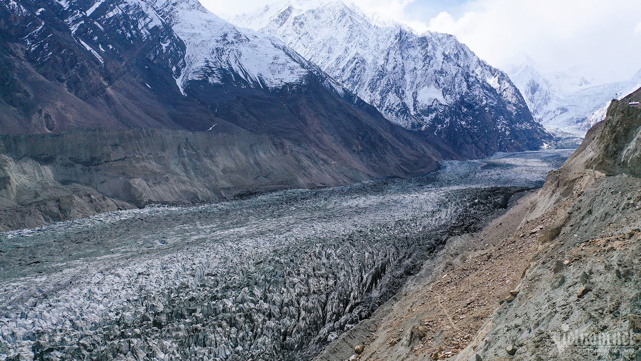 Ngoài sông băng đen, Pakistan còn có dòng sông băng màu trắng độc đáo mang tên Passu. Càng lên cao, mây mù càng bao phủ tạo nên khung cảnh mờ ảo, tiết trời rất lạnh.