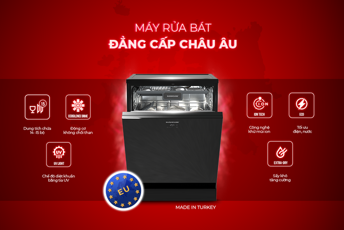 Đại diện Sunhouse cho biết, sản phẩm máy rửa bát thương hiệu Sunhouse được hãng này nhập khẩu nguyên chiếc từ Thổ Nhĩ Kỳ và Malaysia, sản xuất theo quy chuẩn chất lượng nghiêm ngặt. Bước đầu tiếp cận với nhóm sản phẩm công nghệ cao như máy rửa bát, Sunhouse tập trung tối ưu hiệu quả các tính năng cơ bản như: rửa tiết kiệm điện và nước, rửa nhanh, sấy khô tăng cường, hẹn giờ, rửa diệt khuẩn Hygiene, khử mùi ion…