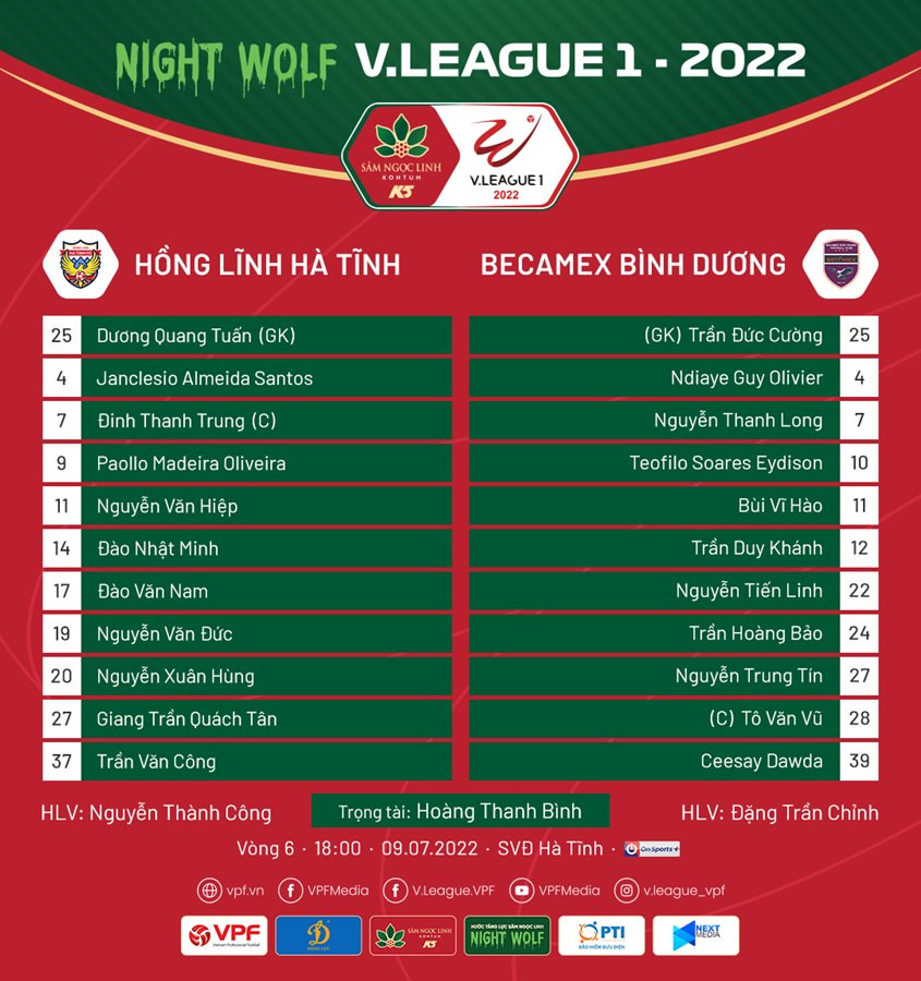 Bình Dương: Đức Cường, Trung Tín, Olivier, Hoàng Bảo, Thanh Long, Sỹ Giáp, Duy Khánh, Văn Vũ, Eydison, Tiến Linh, Dawda