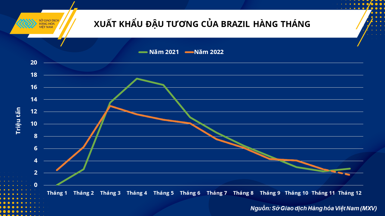Không những thế, Hiệp hội Các nhà Xuất khẩu Ngũ cốc Brazil (ANEC) đã hạ dự báo xuất khẩu đậu tương của nước này trong tháng 12 ở mức 1,72 triệu tấn, giảm so với mức 1,75 triệu tấn ước tính trước đó. Ngoài ra, các lô hàng khô đậu tương xuất khẩu trong tháng 12 của Brazil được ANEC cắt giảm dự báo xuống còn 1,5 triệu tấn, từ mức 1,52 triệu tấn trong báo cáo tuần trước. Hoạt động xuất khẩu hạn chế do tồn kho của Brazil ở mức thấp trong giai đoạn cuối năm cũng hỗ trợ giá các mặt hàng nông sản.