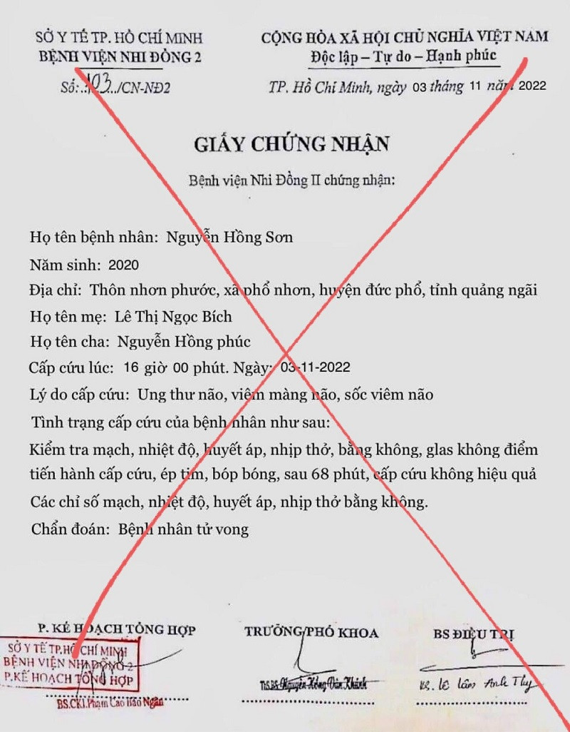 Trước đó, trả lời báo chí, đại diện Bệnh viện Nhi đồng 2 xác nhận hình ảnh giấy chứng nhận từ bệnh viện mà đối tượng này đưa ra là giả mạo. Đối tượng đã cắt ghép chữ ký của bác sĩ điều trị, dấu mộc của Bệnh viện Nhi đồng 2.