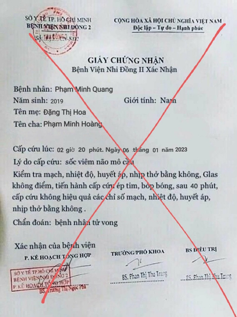 Theo quan sát và tìm hiểu của phóng viên, trong tờ giấy chứng nhận ghi tên bệnh nhân Phạm Minh Quang đề ngày 6/1/2023, có thể nhìn thấy rõ thông tin bị sửa đổi ở phần tên bệnh nhân, cha, mẹ, thời điểm được đưa vào cấp cứu. Và dù lý do cấp cứu là sốc viêm não mô cầu, nhưng bác sĩ điều trị Phan Thị Thu Trang lại là Phó Khoa Ung bướu – Huyết học.