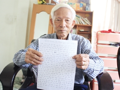 | Ông Lữ Điều với những tờ nhật ký ghi lại tháng ngày ở Hoàng Sa. Ảnh: Nam Cường. |