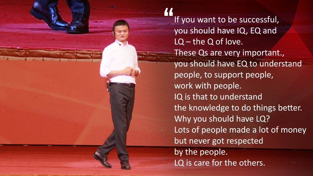 Nếu bạn muốn thành công, bạn nên có IQ, EQ và LQ – chỉ số của tình yêu. Những chỉ số này rất quan trọng. Bạn nên có EQ để hiểu mọi người, giúp đỡ mọi người, làm việc cùng mọi người. IQ là để hiểu kiến thức, để làm mọi thứ tốt hơn. Tại sao bạn nên có LQ? Nhiều người kiếm được rất nhiều tiền nhưng không bao giờ được người khác tôn trọng. LQ là sự quan tâm tới người khác.