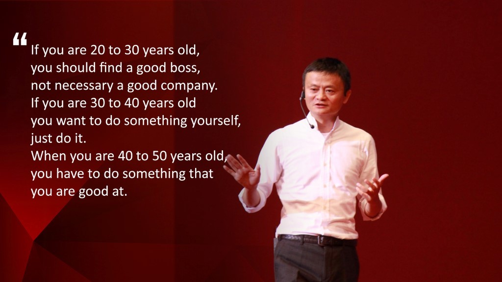 Nếu bạn đang từ 20 đến 30 tuổi, bạn nên tìm một lãnh đạo tốt, thay vì một công ty tốt. Hãy tìm một lãnh đạo tốt để học hỏi. Nếu bạn từ 30 đến 40 tuổi, bạn muốn làm một điều gì đó, hãy cứ làm. Khi bạn từ 40 đến 50 tuổi, bạn phải làm thứ mà bạn giỏi.