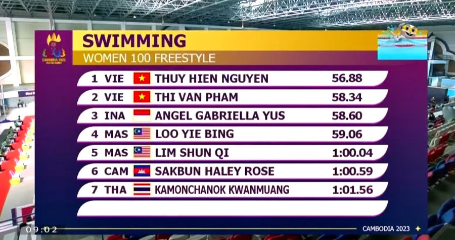 Kình ngư 14 tuổi của Việt Nam Nguyễn Thúy Hiền xuất sắc cán đích thứ 3 nội dung 100m tự do nữ, với thành tích 56 giây 42 để giành HCĐ, thành tích rất đáng khen đối với thần đồng bơi lội của Việt Nam. Phạm Thị Vân đứng thứ 4 khi đạt thời gian 57 giây 05.