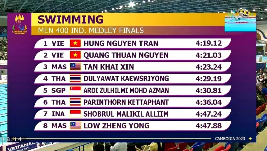 Ở chung kết cự ly 400m hỗn hợp là màn cạnh tranh quyết liệt giữa kỷ lục gia SEA Games Trần Hưng Nguyên và Nguyễn Quang Thuấn. Dù bị em trai Ánh Viên dẫn trước ở 100m cuối, nhưng đến 50m bơi tự do cuối cùng, Hưng Nguyên có cú nước rút mạnh mẽ để qua mặt người đồng đội và bảo vệ thành công tấm HCV. Hưng Nguyên đạt thành tích 4 phút 19 giây 12, trong khi Quang Thuấn đạt thành tích 4 phút 21 giây 03.