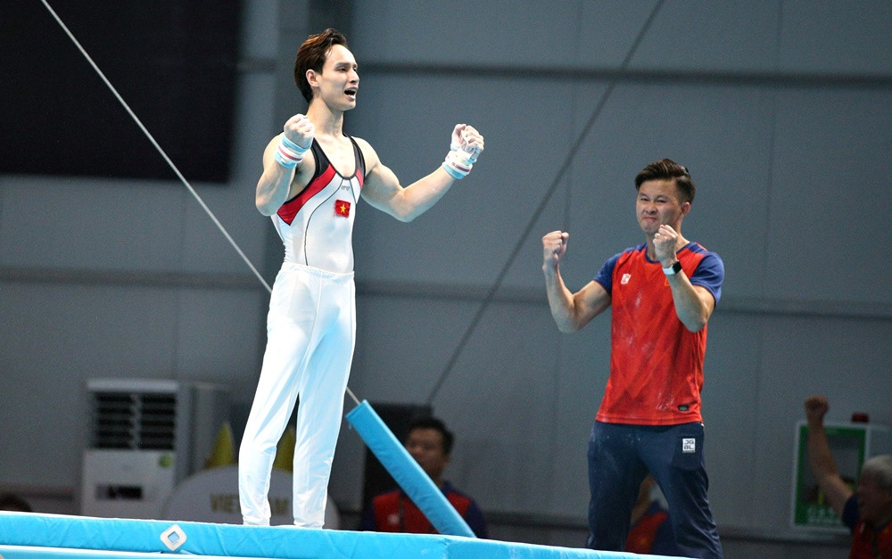 Tuyển TDDC Việt Nam gồm các VĐV Đinh Phương Thành, Lê Thanh Tùng, Đặng Ngọc Xuân Thiện, Văn Vĩ Lương, Nguyễn Văn Khánh Phong, Trịnh Hải Khang đang thi chung kết nội dung toàn năng đồng đội nam.